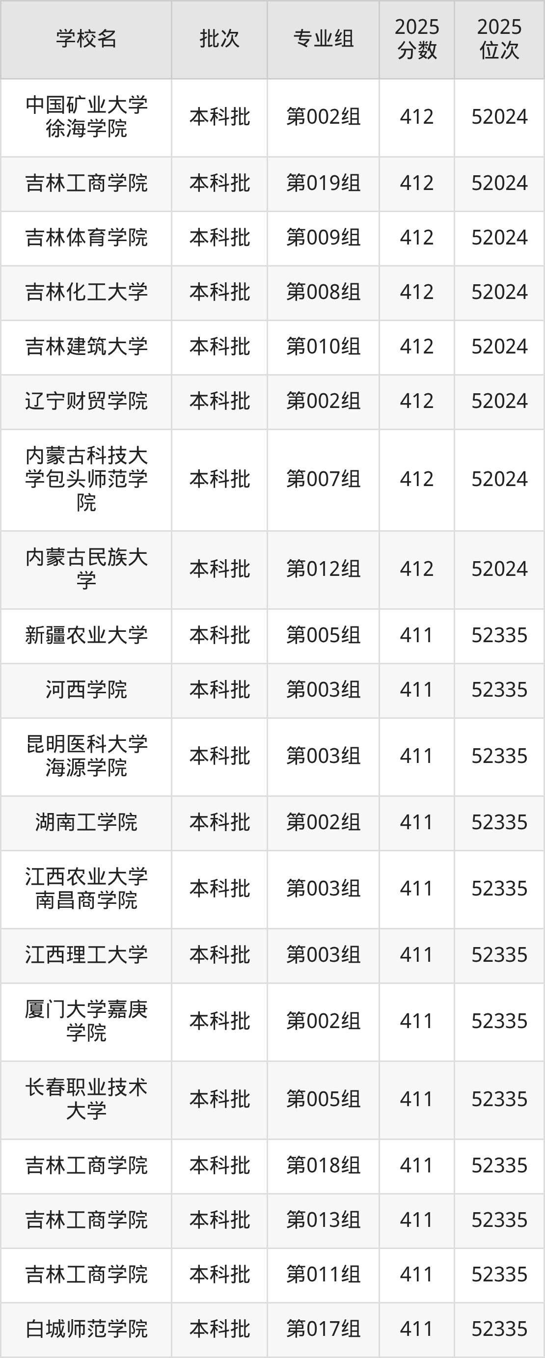 2025年吉林高考物理类412分(51693名~52024名)能上的大学有内蒙古民族大学第012组、内蒙古科技大学包头师范学院第007组、辽宁财贸学院第002组、吉林建筑大学第010组等。