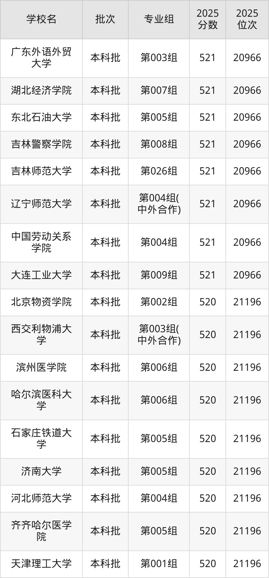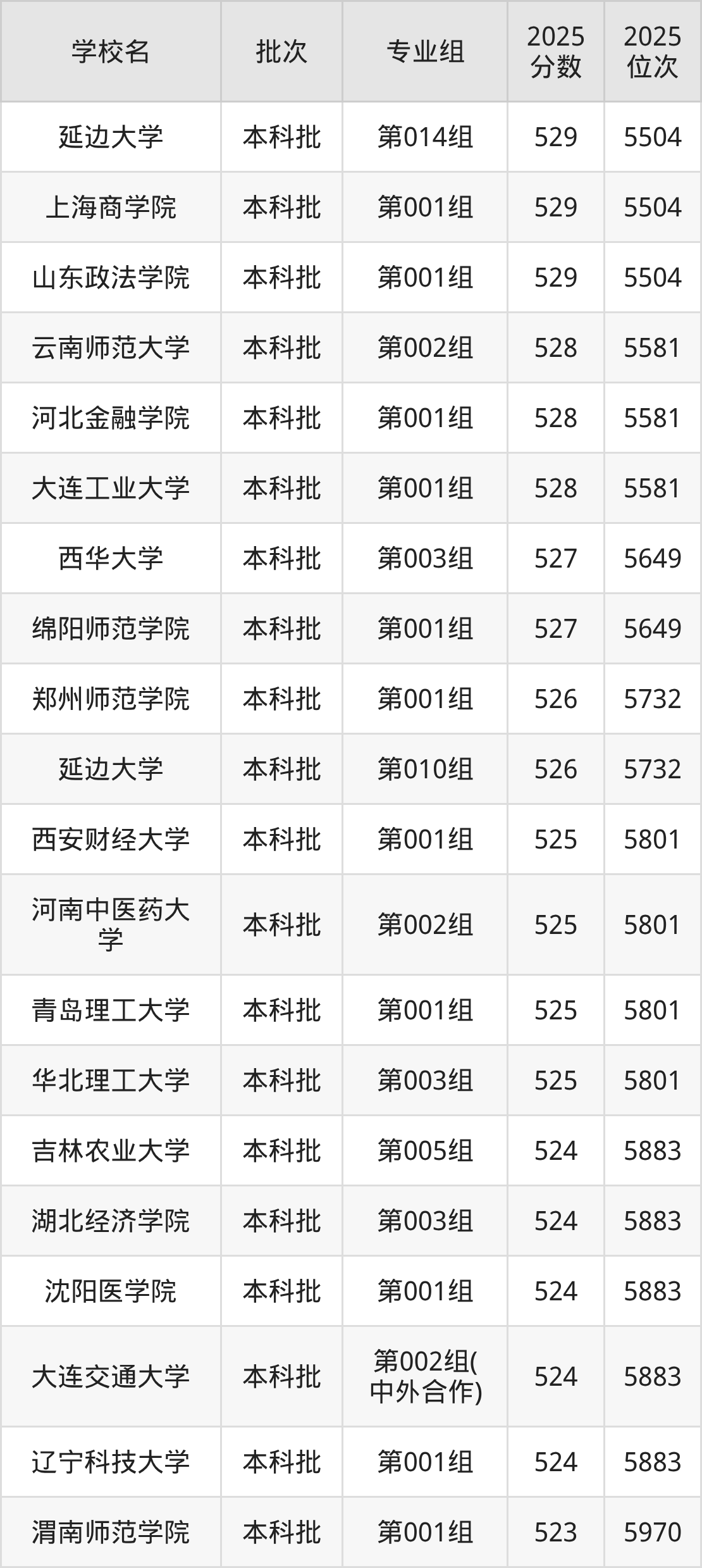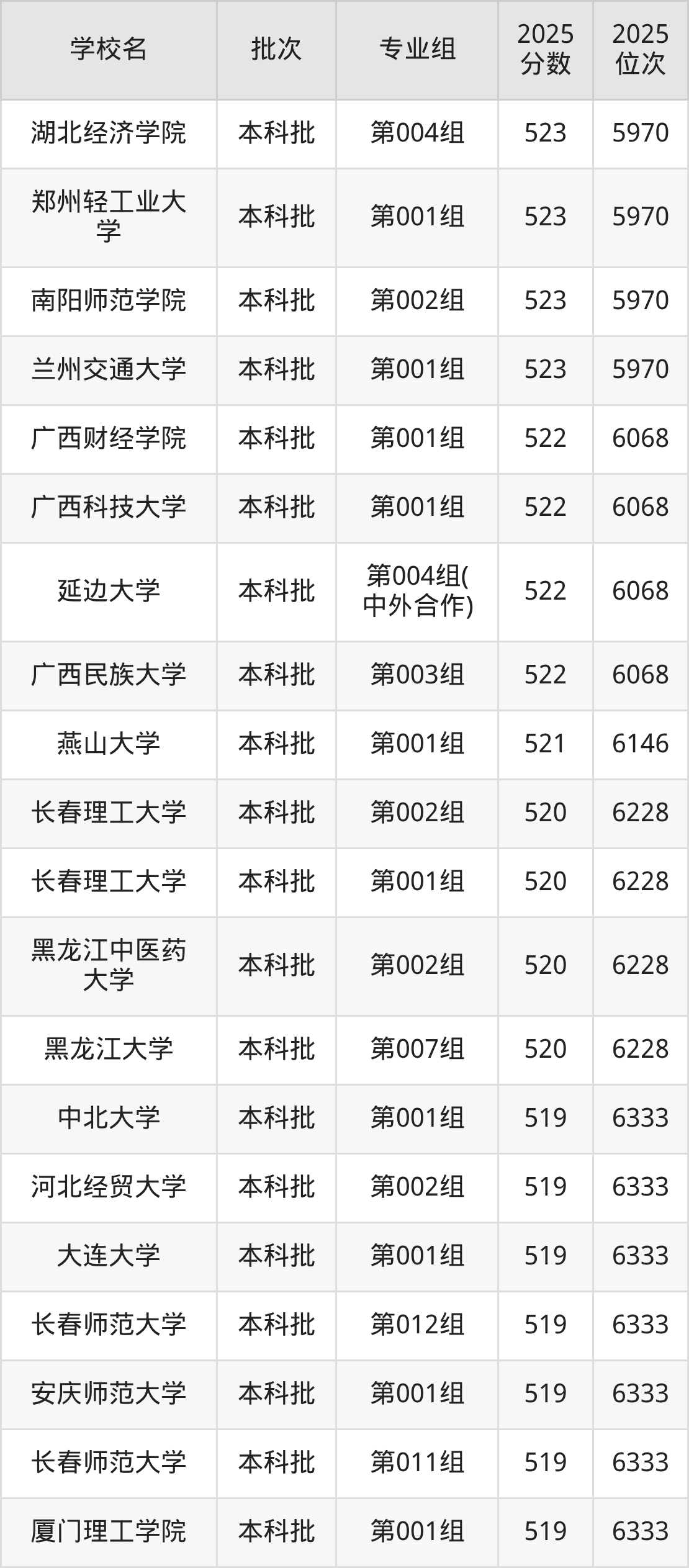 2025年吉林高考历史类522分(5971名~6068名)能上的大学有延边大学第004组(中外合作)、广西民族大学第003组、广西科技大学第001组、广西财经学院第001组。