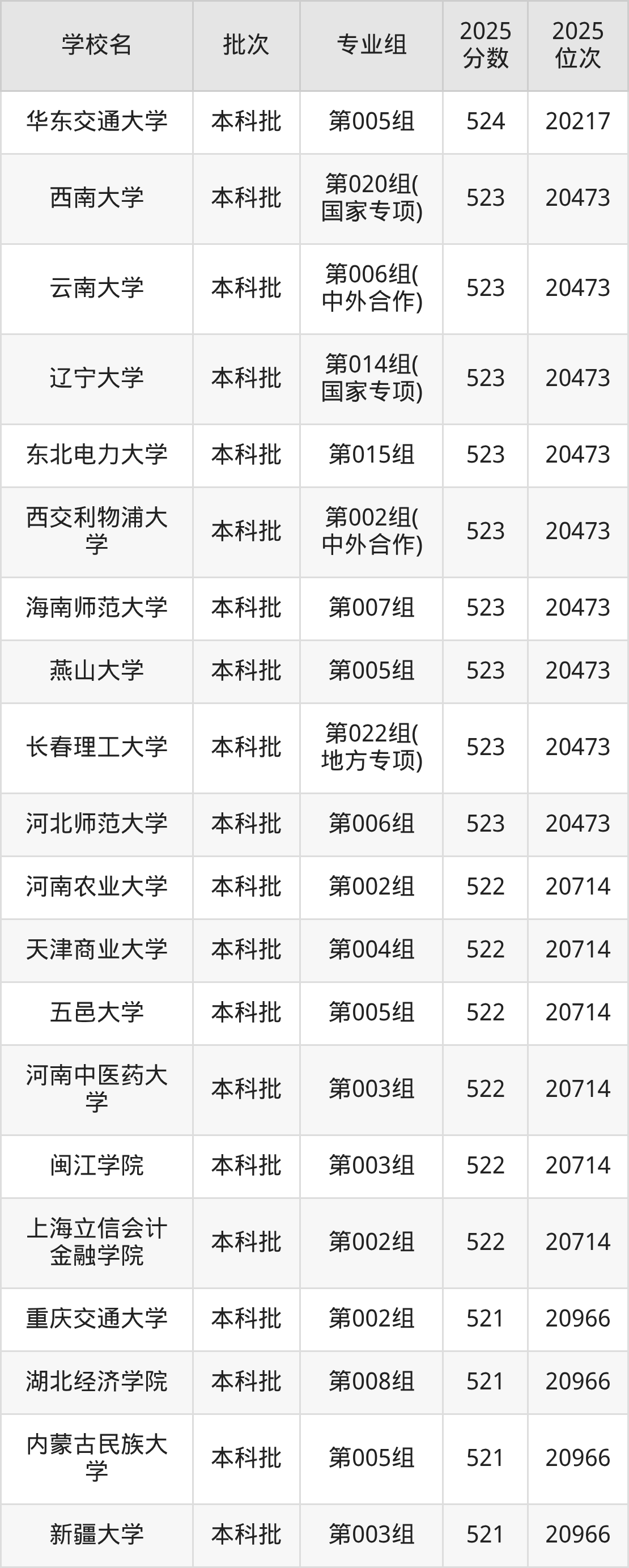 2025年吉林高考物理类522分(20474名~20714名)能上的大学有天津商业大学第004组、上海立信会计金融学院第002组、闽江学院第003组、河南农业大学第002组等。