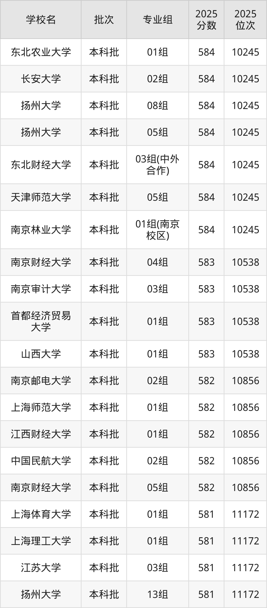 2025年江苏高考历史类582分(10539名~10856名)能上的大学有南京邮电大学02组、南京财经大学05组、上海师范大学01组、江西财经大学01组等。
