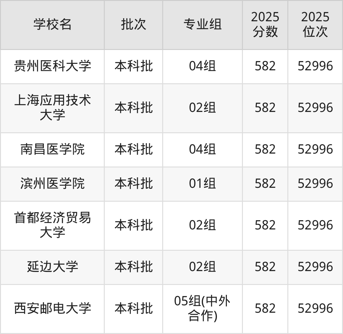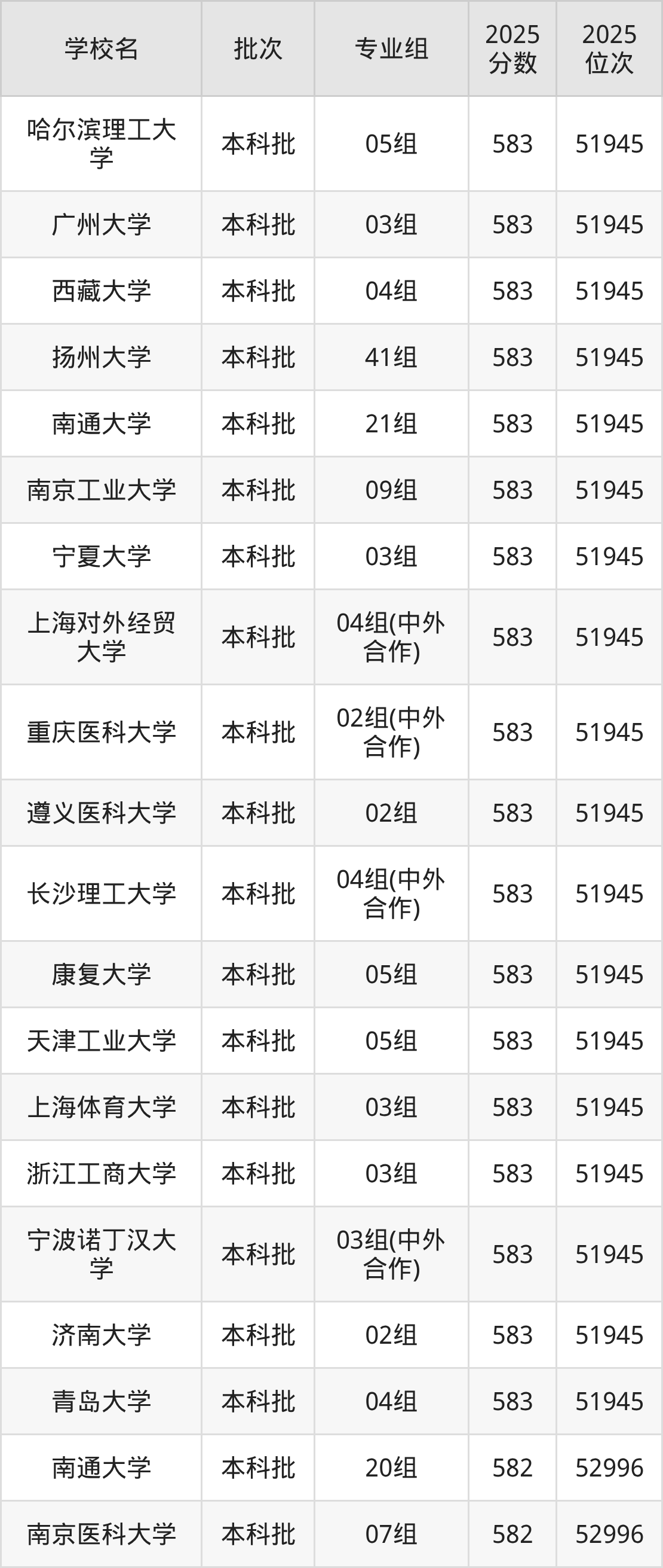 2025年江苏高考物理类582分(51946名~52996名)能上的大学有南京医科大学07组、南通大学20组、上海应用技术大学02组、南昌医学院04组等。