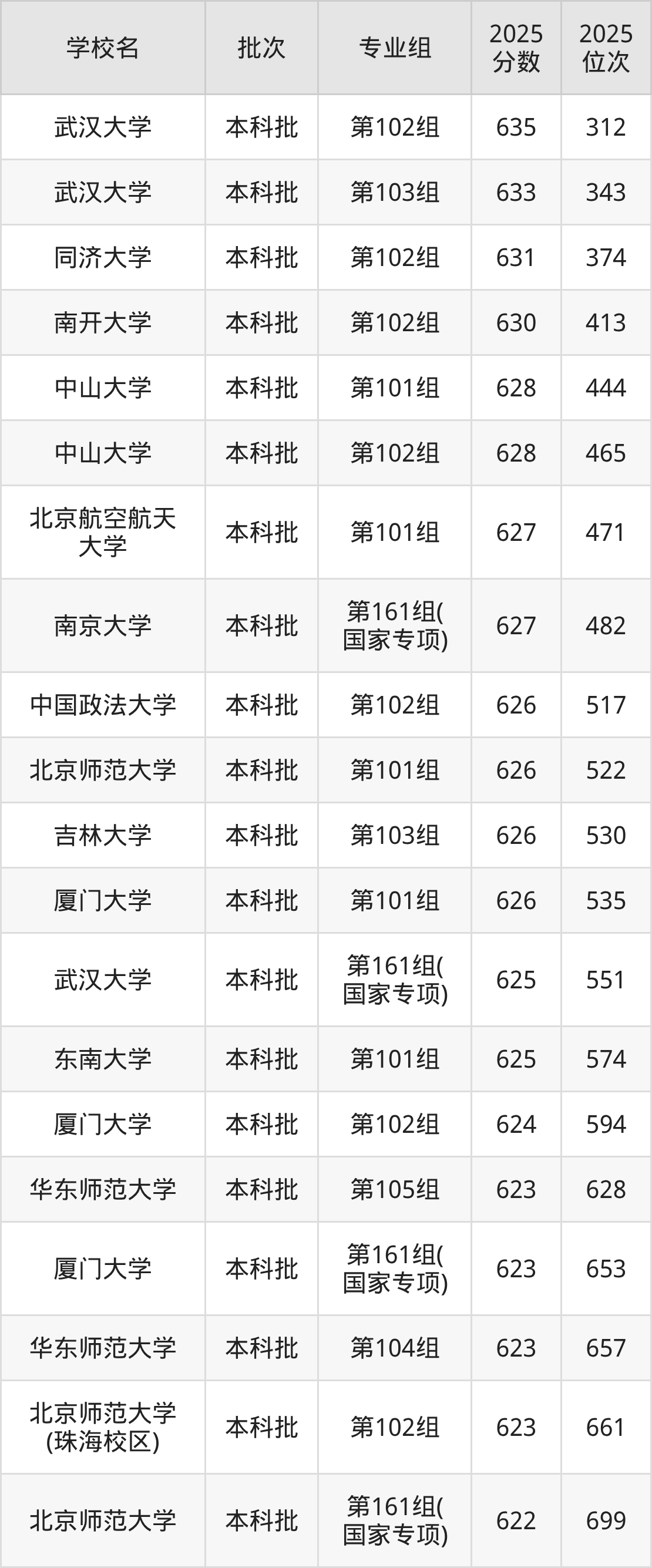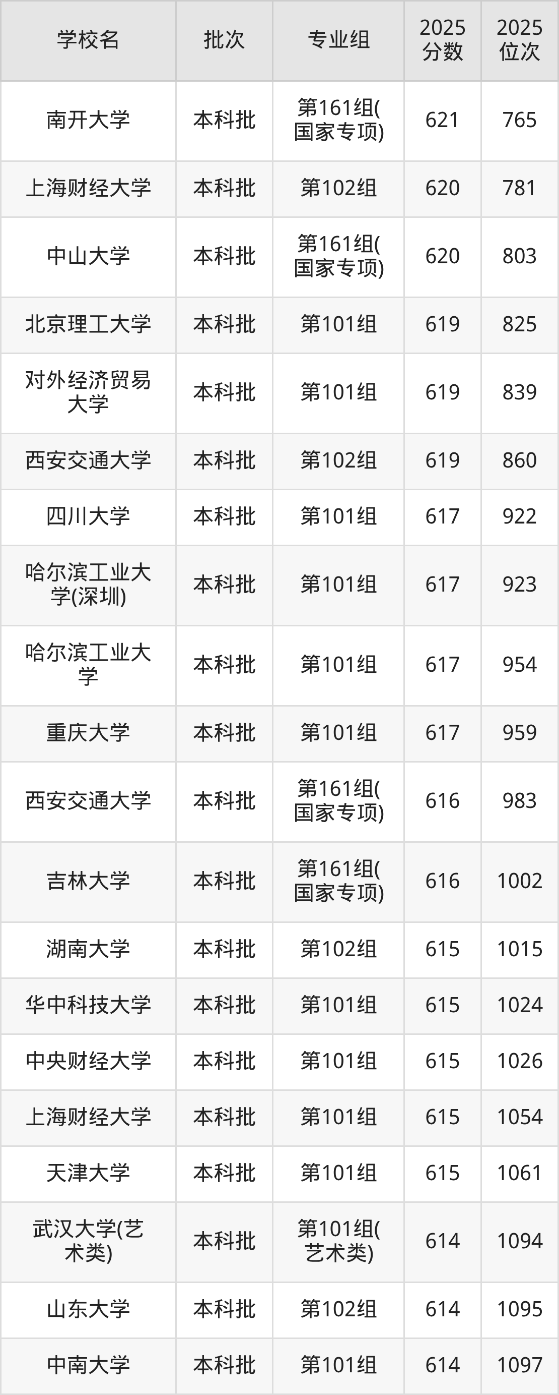 2025年江西高考历史类620分(768名~814名)能上的大学有上海财经大学第102组、中山大学第161组(国家专项)。