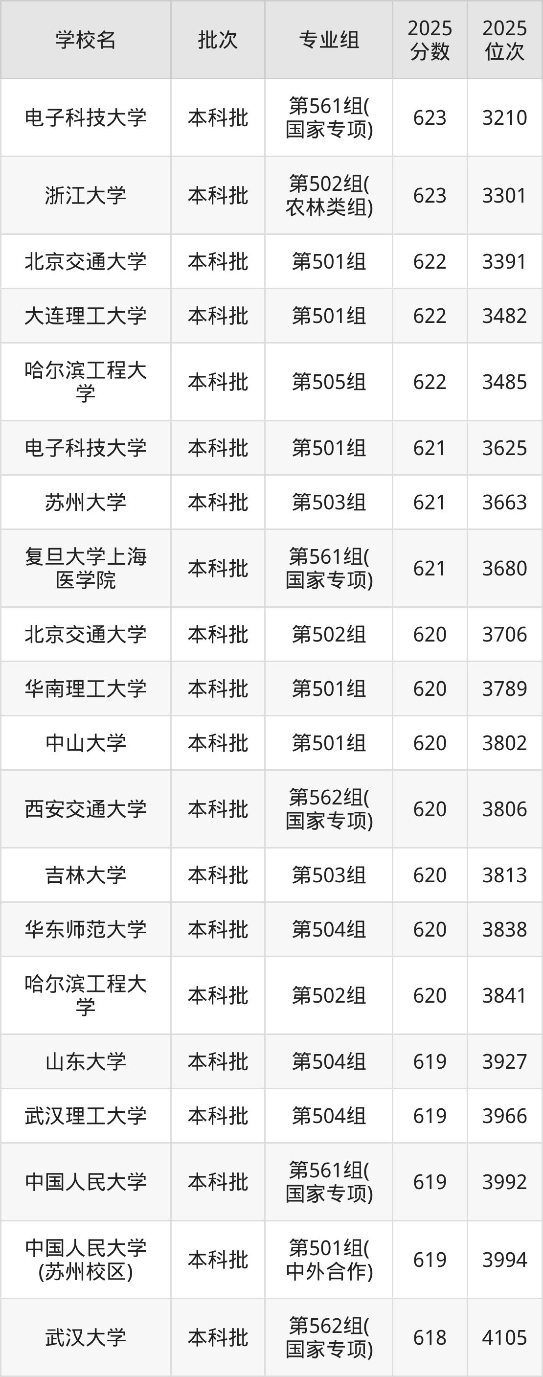 2025年江西高考物理类620分(3695名~3877名)能上的大学有华东师范大学第504组、北京交通大学第502组、吉林大学第503组、哈尔滨工程大学第502组等。