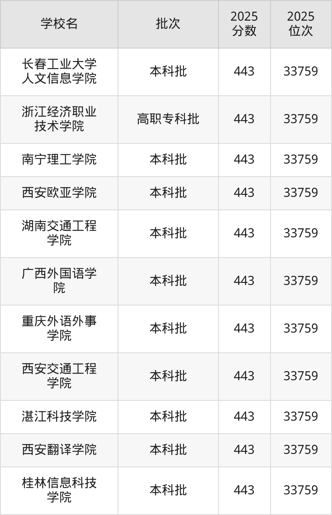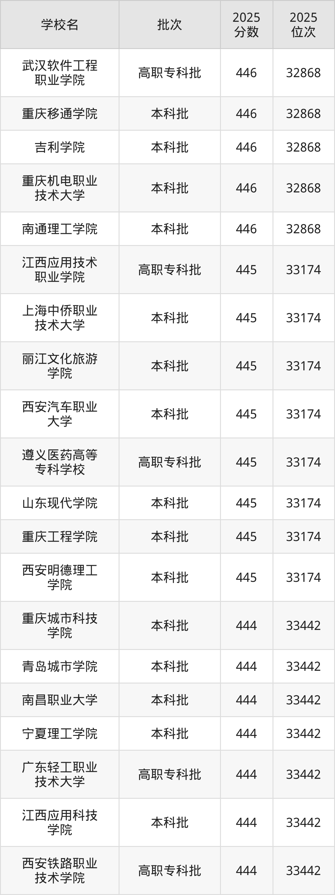 2025年重庆高考历史类444分(33175名~33442名)能上的大学有重庆城市科技学院、江西应用科技学院、青岛城市学院、西安铁路职业技术学院等。