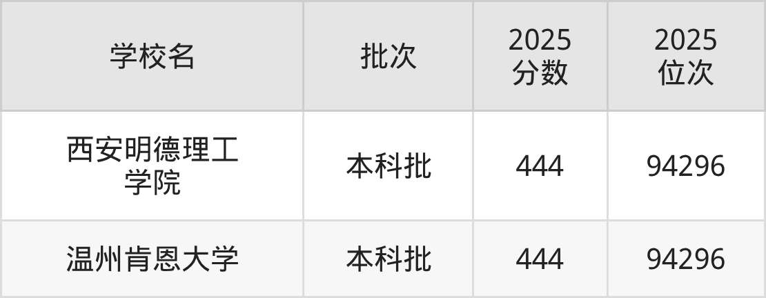 2025年重庆高考物理类444分(93816名~94296名)能上的大学有西安明德理工学院、温州肯恩大学。