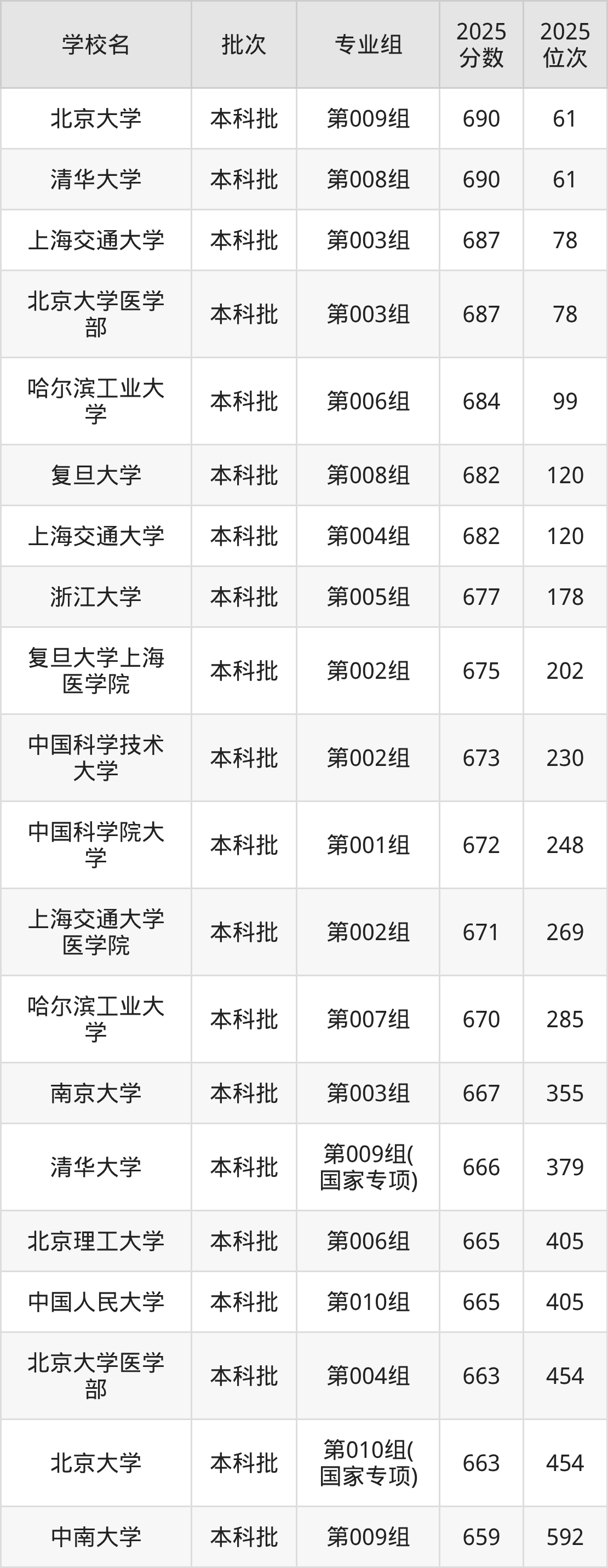 2025年黑龙江高考物理类660分(514名~548名)录取位次低于该区间(较稳妥)的有北京理工大学第007组(592名)、中南大学第009组(592名)等;录取位次高于该区间(可冲)的有北京大学第010组(国家专项)(454名)、北京大学医学部第004组(454名)等。