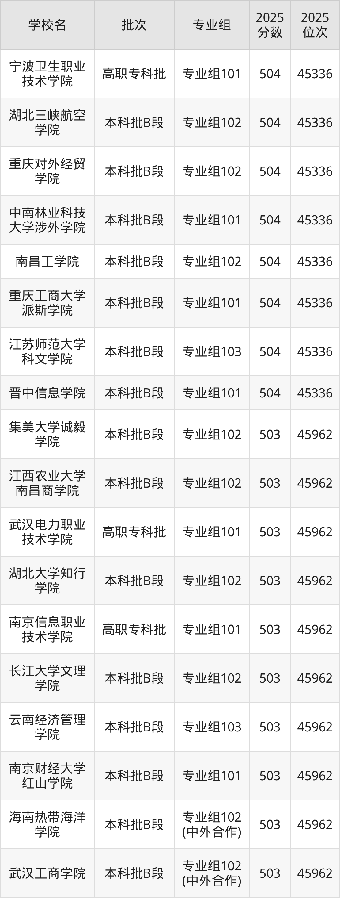 2025年四川高考历史类503分(45337名~45962名)能上的大学有武汉电力职业技术学院专业组101、江西农业大学南昌商学院专业组102、武汉工商学院专业组102(中外合作)、集美大学诚毅学院专业组102等。