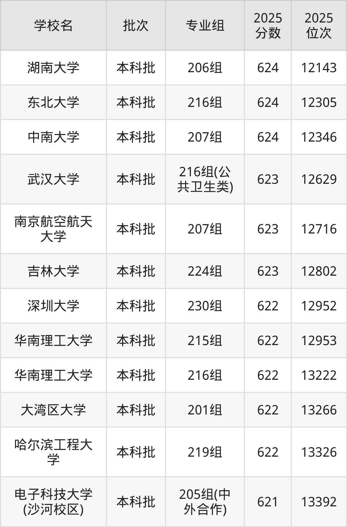 2025年广东高考物理类623分(12433名~12908名)能上的大学有吉林大学224组、南京航空航天大学207组、武汉大学216组(公共卫生类)。
