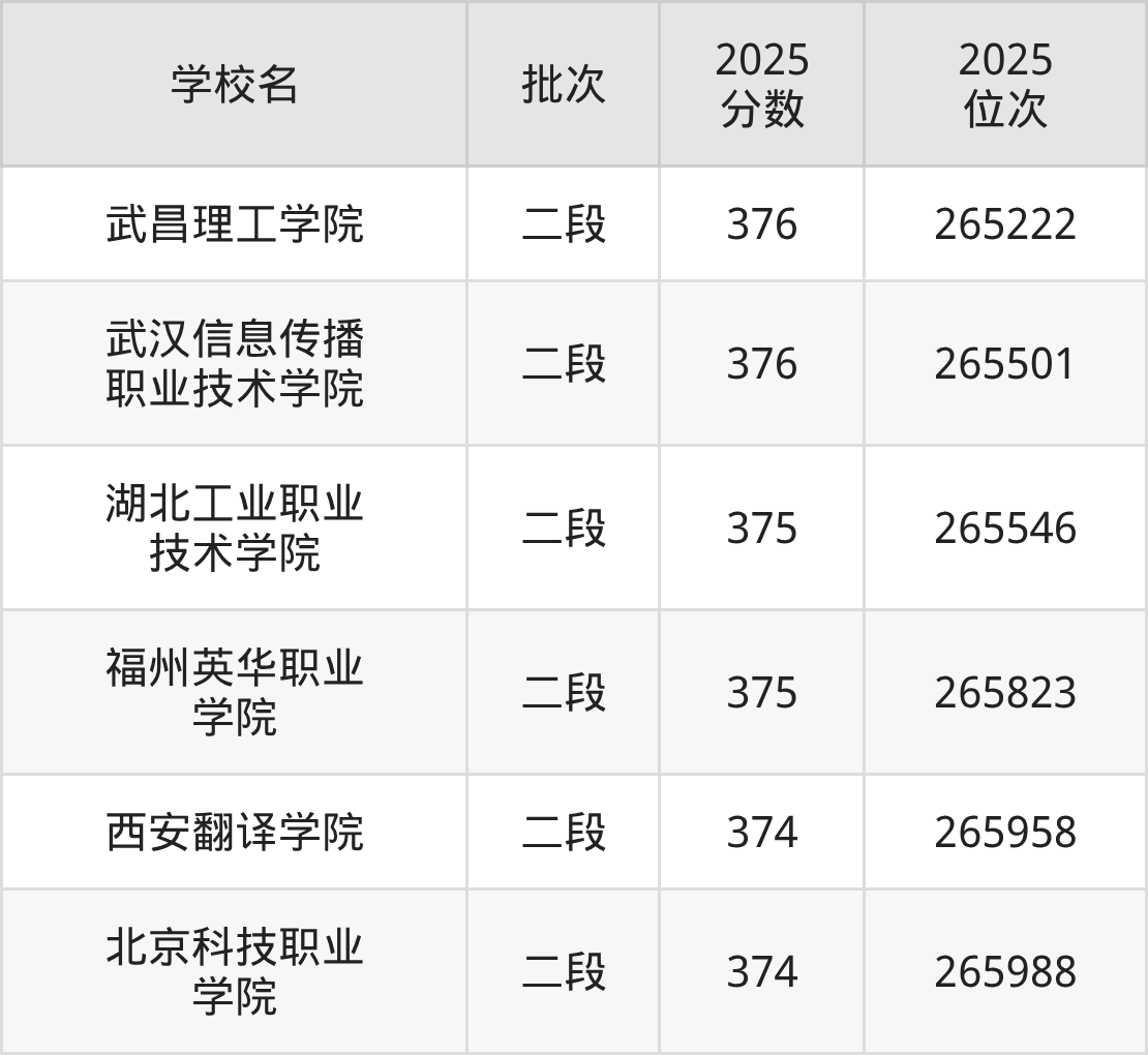 另外录取位次低于该区间(较稳妥)的有西安翻译学院(265958名)、北京科技职业学院(265988名)等;录取位次高于该区间(可冲)的有武汉信息传播职业技术学院(265501名)、武昌理工学院(265222名)等。