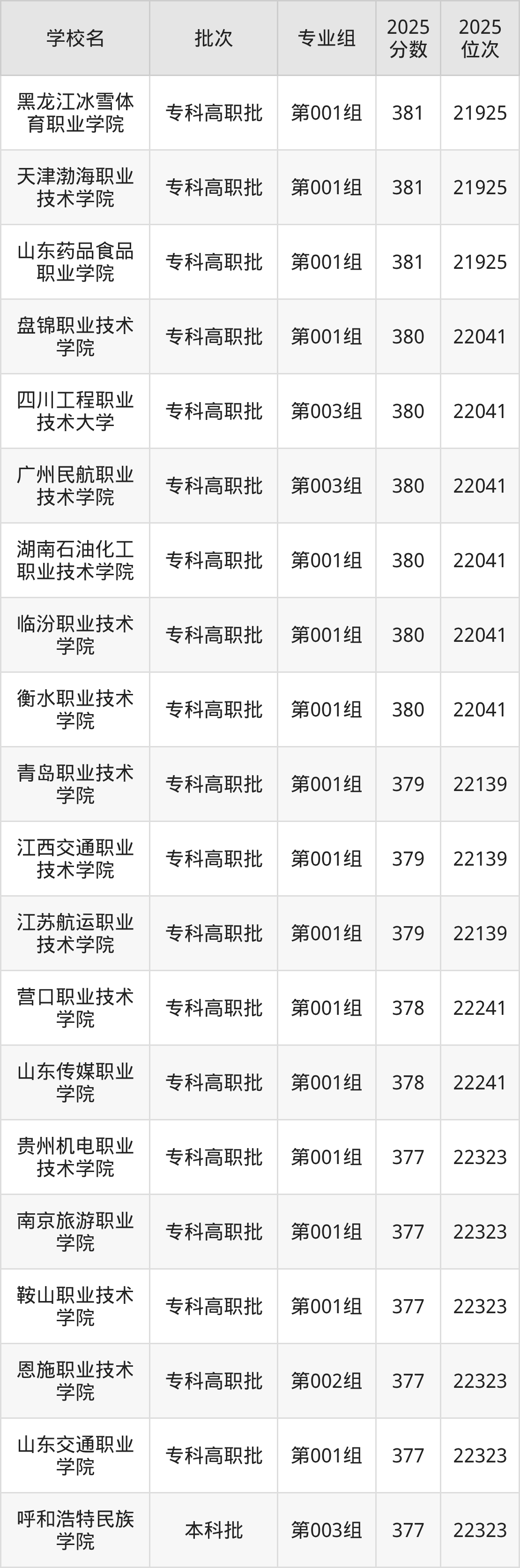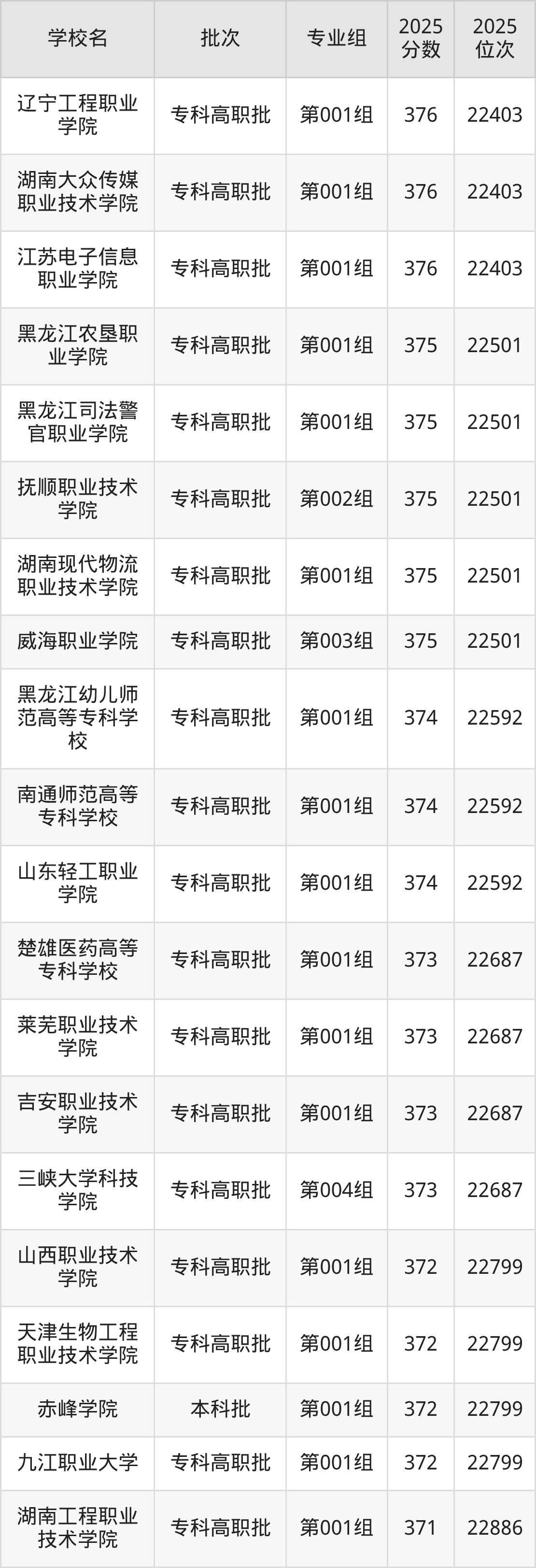 2025年吉林高考历史类375分(22404名~22501名)能上的大学有抚顺职业技术学院第002组、黑龙江农垦职业学院第001组、黑龙江司法警官职业学院第001组、威海职业学院第003组等。