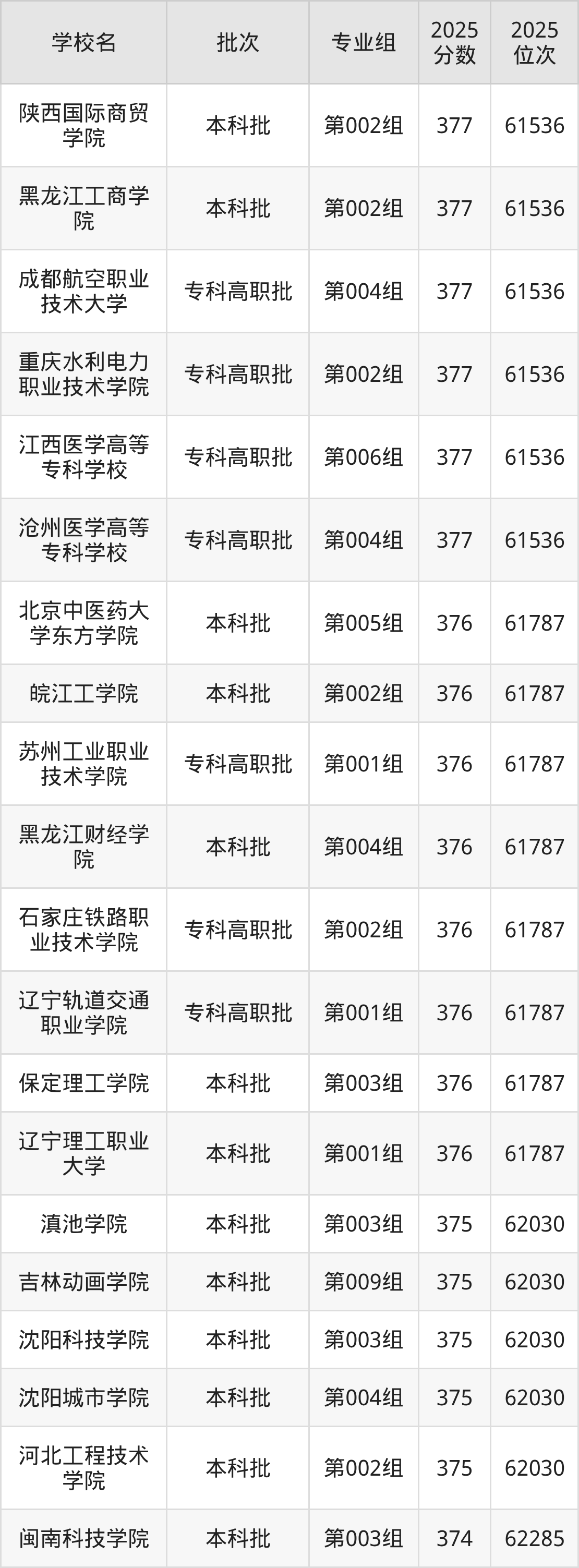 2025年吉林高考物理类375分(61788名~62030名)能上的大学有河北工程技术学院第002组、沈阳城市学院第004组、沈阳科技学院第003组、吉林动画学院第009组等。