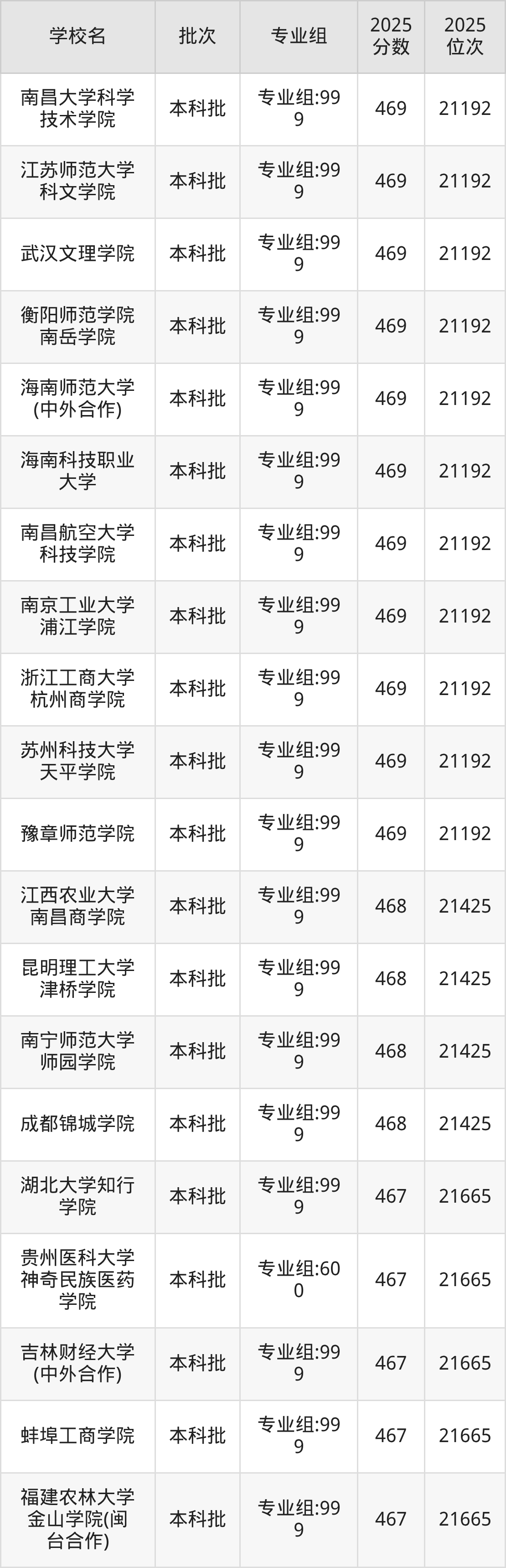 2025年福建高考历史类469分(20966名~21192名)能上的大学有海南科技职业大学专业组:999、海南师范大学(中外合作)专业组:999、衡阳师范学院南岳学院专业组:999、江苏师范大学科文学院专业组:999等。