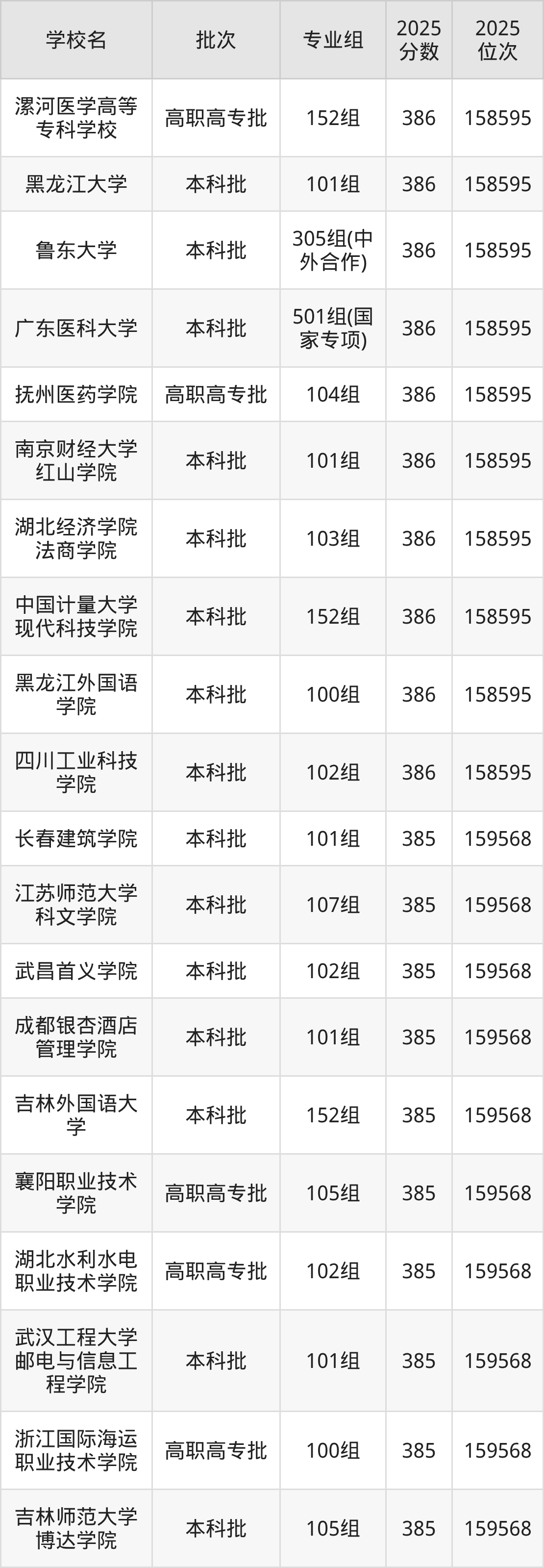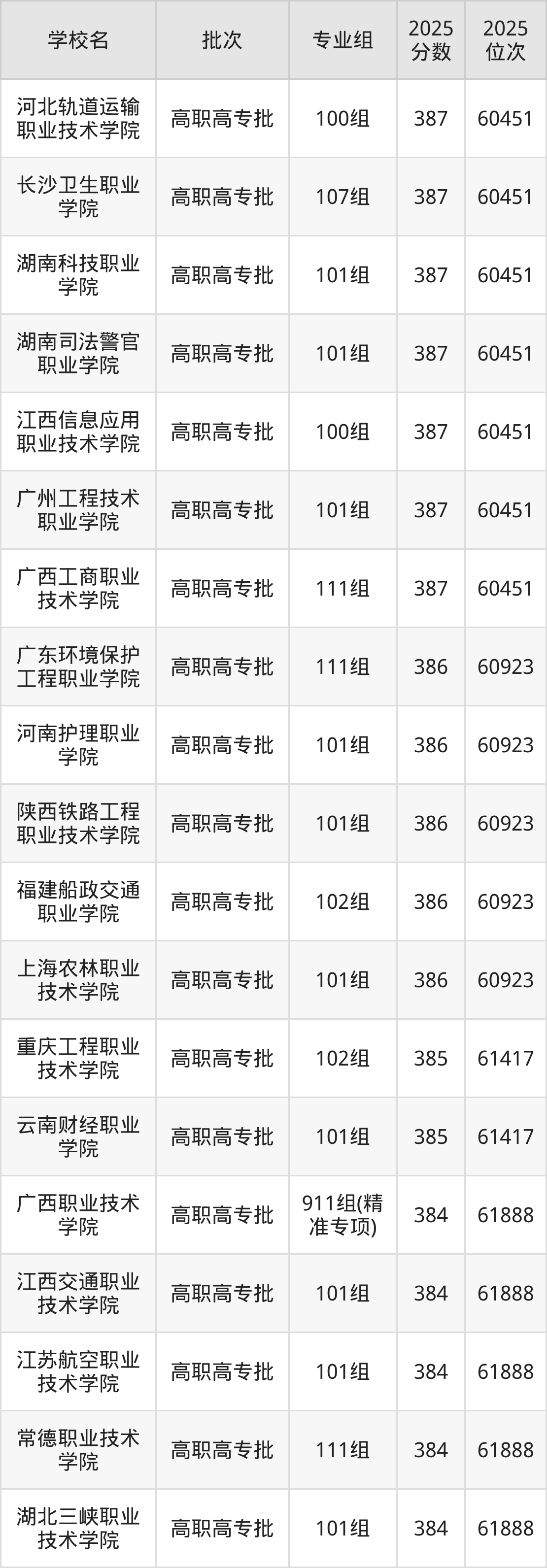 2025年广西高考历史类385分(60924名~61417名)能上的大学有重庆工程职业技术学院102组、云南财经职业学院101组。