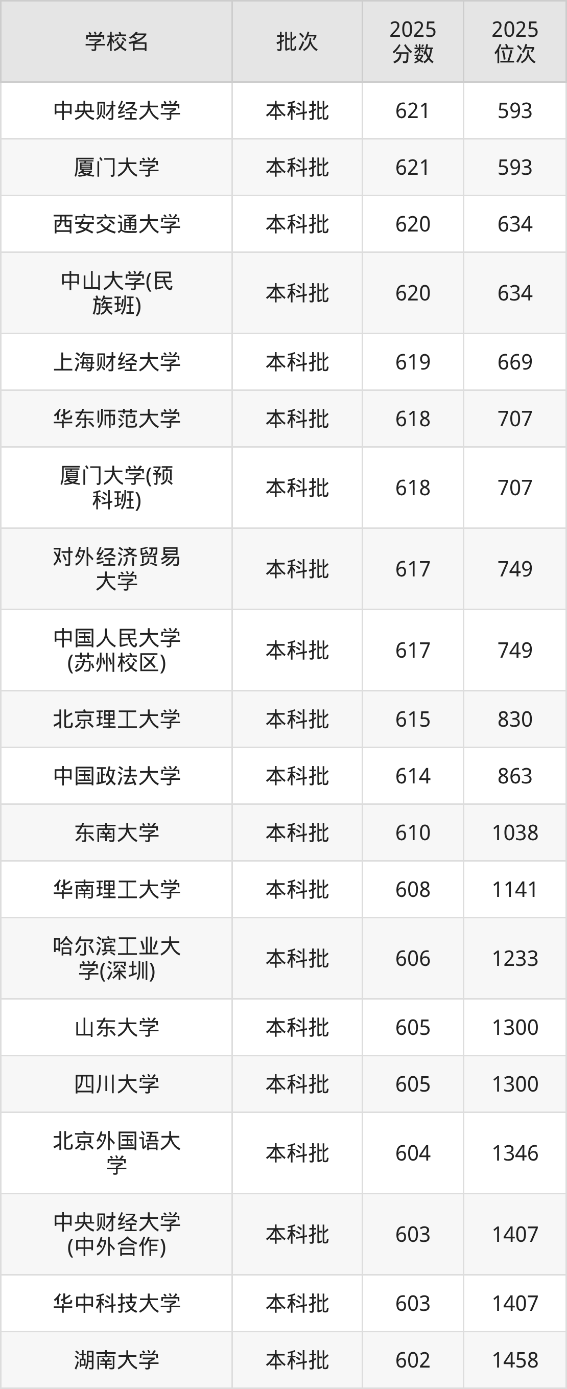 2025年重庆高考历史类609分(1039名~1091名)录取位次低于该区间(较稳妥)的有华南理工大学(1141名)、哈尔滨工业大学(深圳)(1233名)等;录取位次高于该区间(可冲)的有东南大学(1038名)、中国政法大学(863名)等。