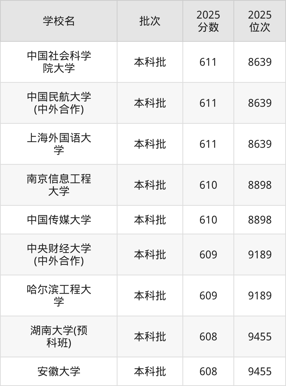 另外录取位次低于该区间(较稳妥)的有湖南大学(预科班)(9455名)、安徽大学(9455名)等;录取位次高于该区间(可冲)的有南京信息工程大学(8898名)、中国传媒大学(8898名)等。