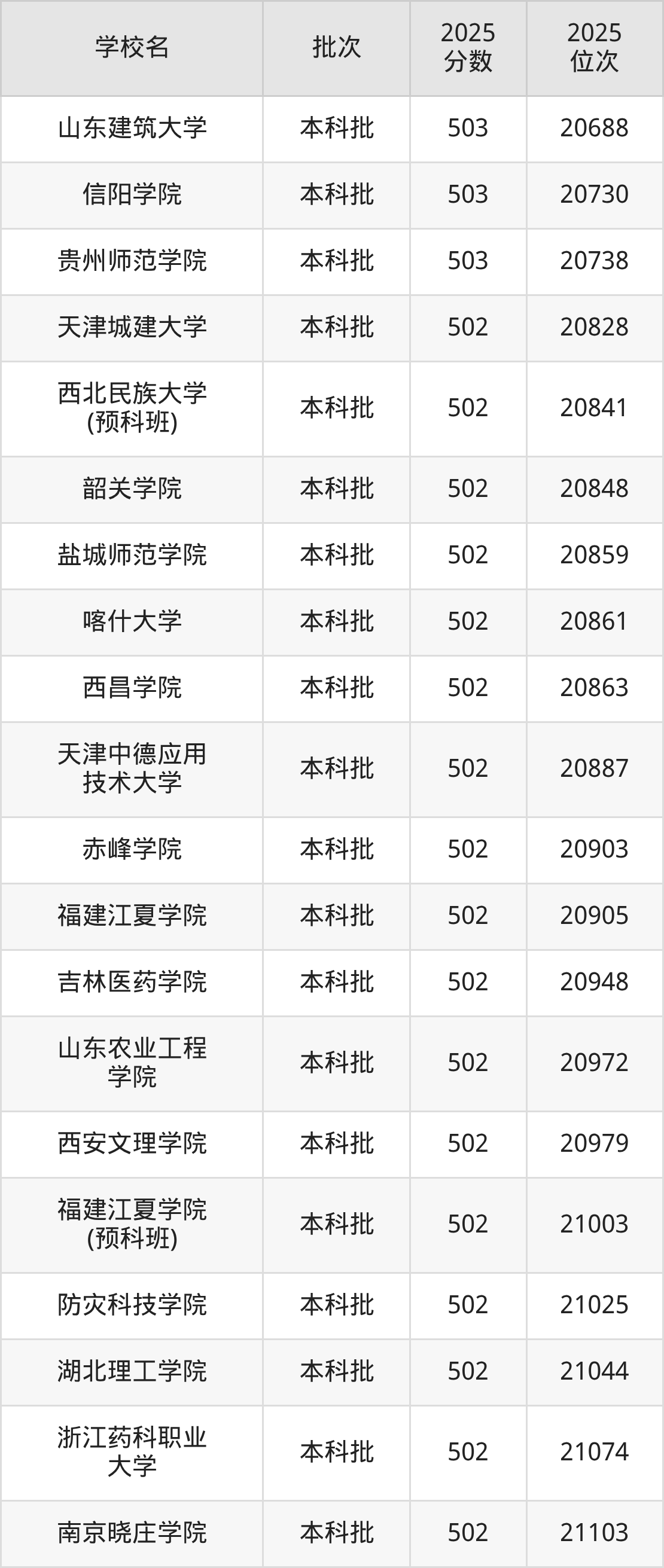 2025年贵州高考历史类502分(20765名~21129名)能上的大学有山东农业工程学院、绵阳师范学院、防灾科技学院、天津中德应用技术大学等。