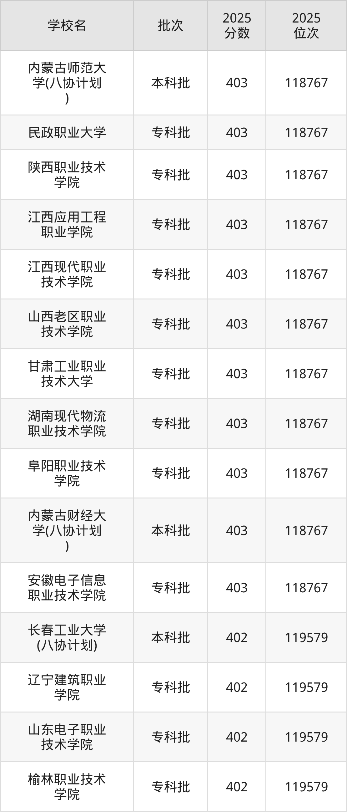 2025年河北高考历史类402分(118768名~119579名)能上的大学有辽宁建筑职业学院、山东电子职业技术学院、长春工业大学(八协计划)、榆林职业技术学院。