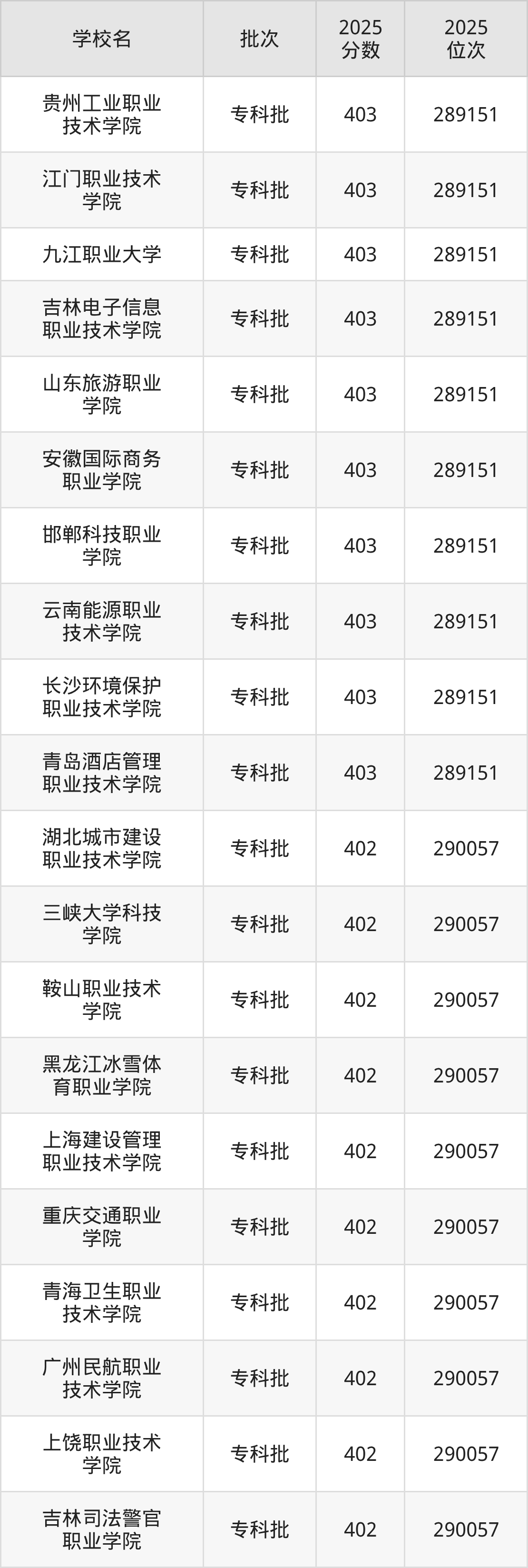 2025年河北高考物理类402分(289152名~290057名)能上的大学有鞍山职业技术学院、三峡大学科技学院、上海建设管理职业技术学院、重庆交通职业学院等。