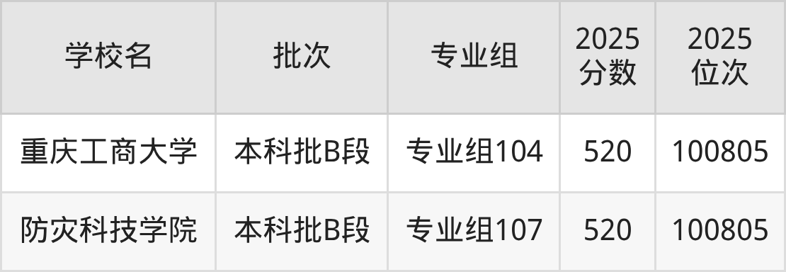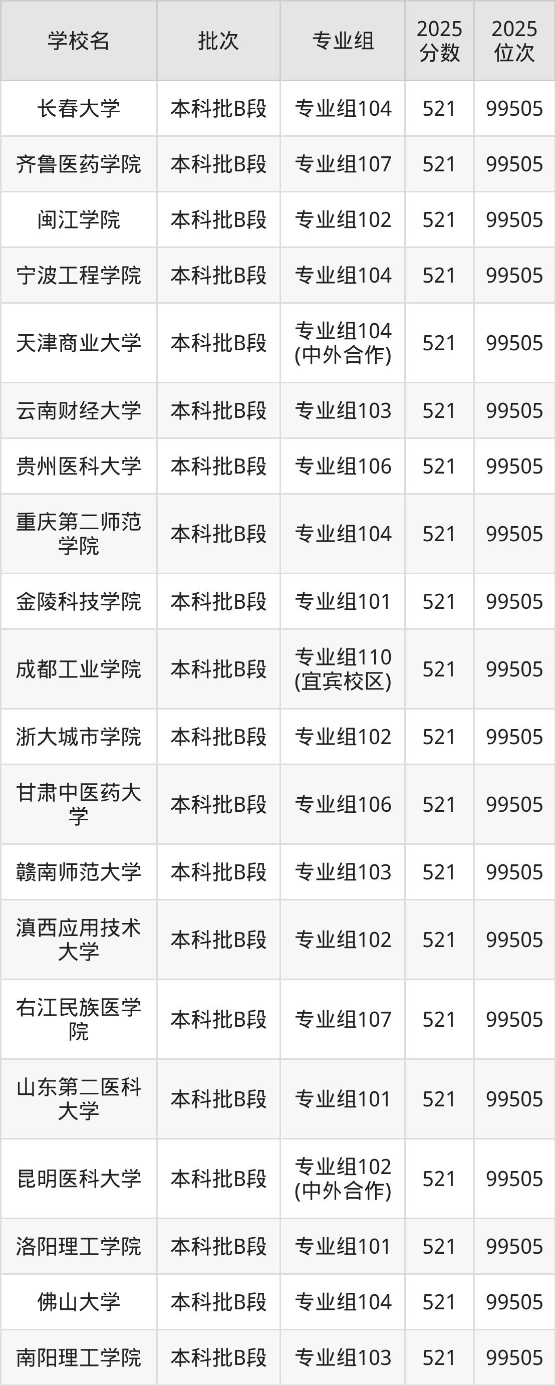 另外录取位次低于该区间(较稳妥)的有重庆医科大学专业组107(中外合作)(102062名)、江西水利电力大学专业组101(102062名)等;录取位次高于该区间(可冲)的有贵州医科大学专业组106(99505名)、天津商业大学专业组104(中外合作)(99505名)等。