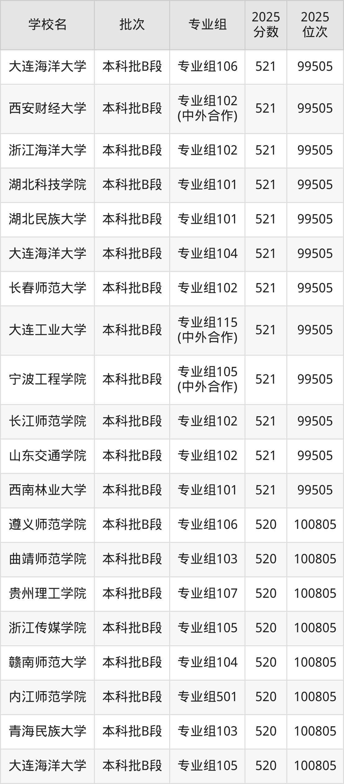 2025年四川高考物理类520分(99506名~100805名)能上的大学有贵州理工学院专业组107、浙江传媒学院专业组105、赣南师范大学专业组104、内江师范学院专业组501等。