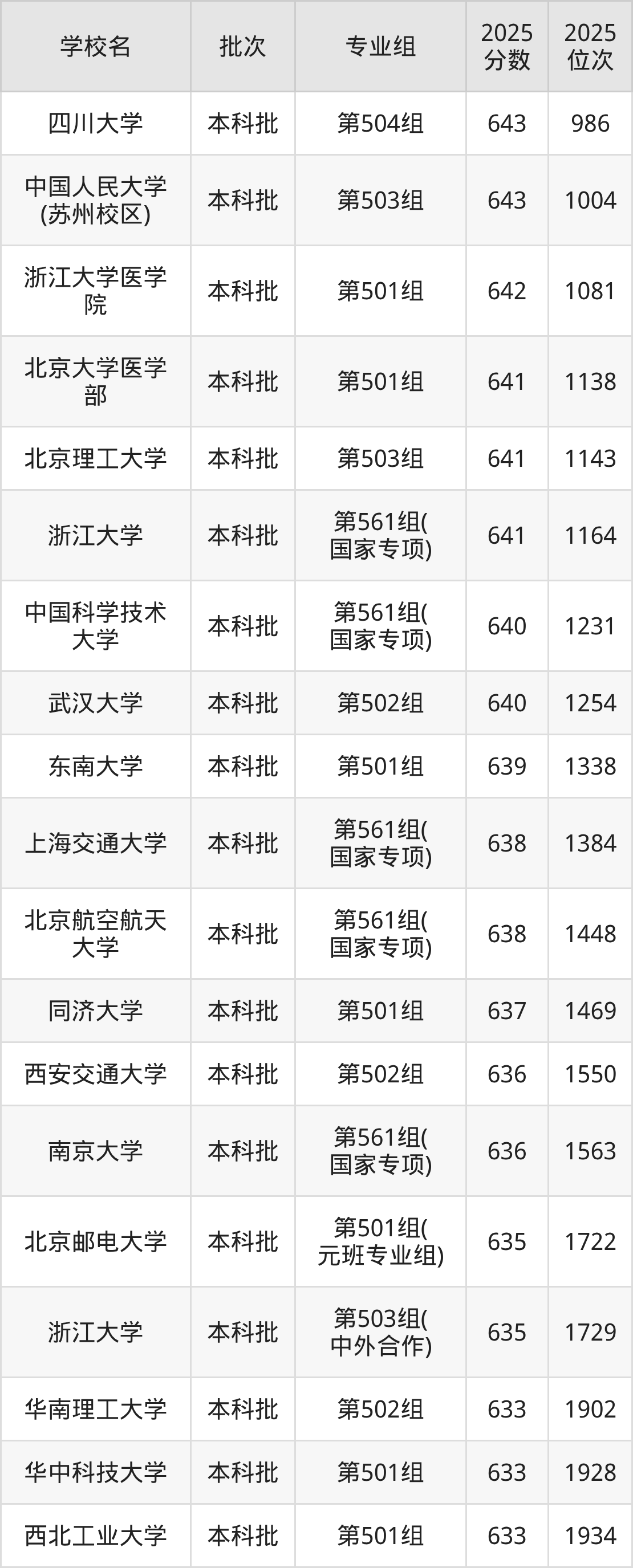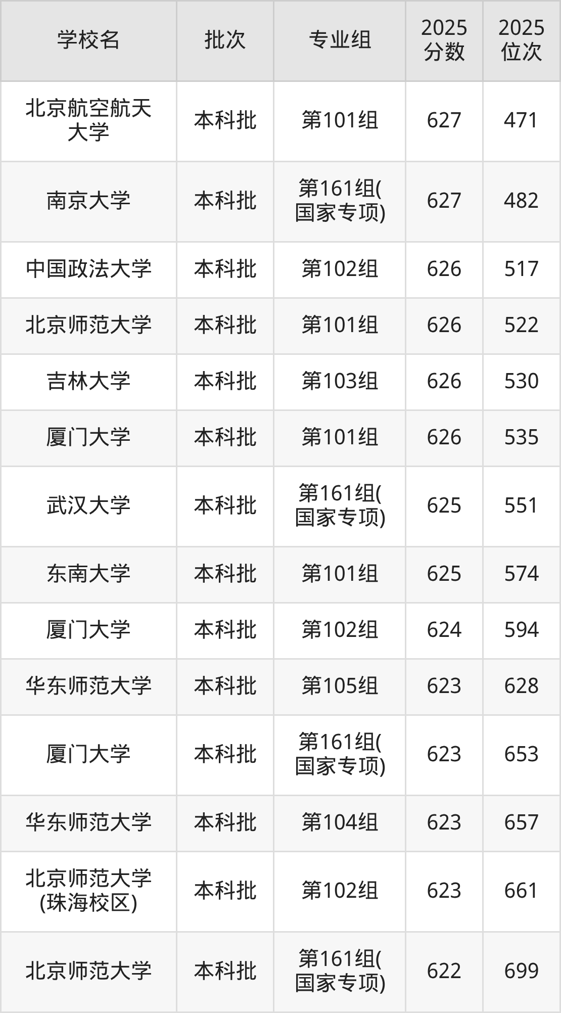 2025年江西高考历史类638分(222名~242名)录取位次低于该区间(较稳妥)的有上海交通大学第161组(国家专项)(256名)、武汉大学第102组(312名)等;录取位次高于该区间(可冲)的有南京大学第101组(161名)、中国人民大学第161组(国家专项)(156名)等。