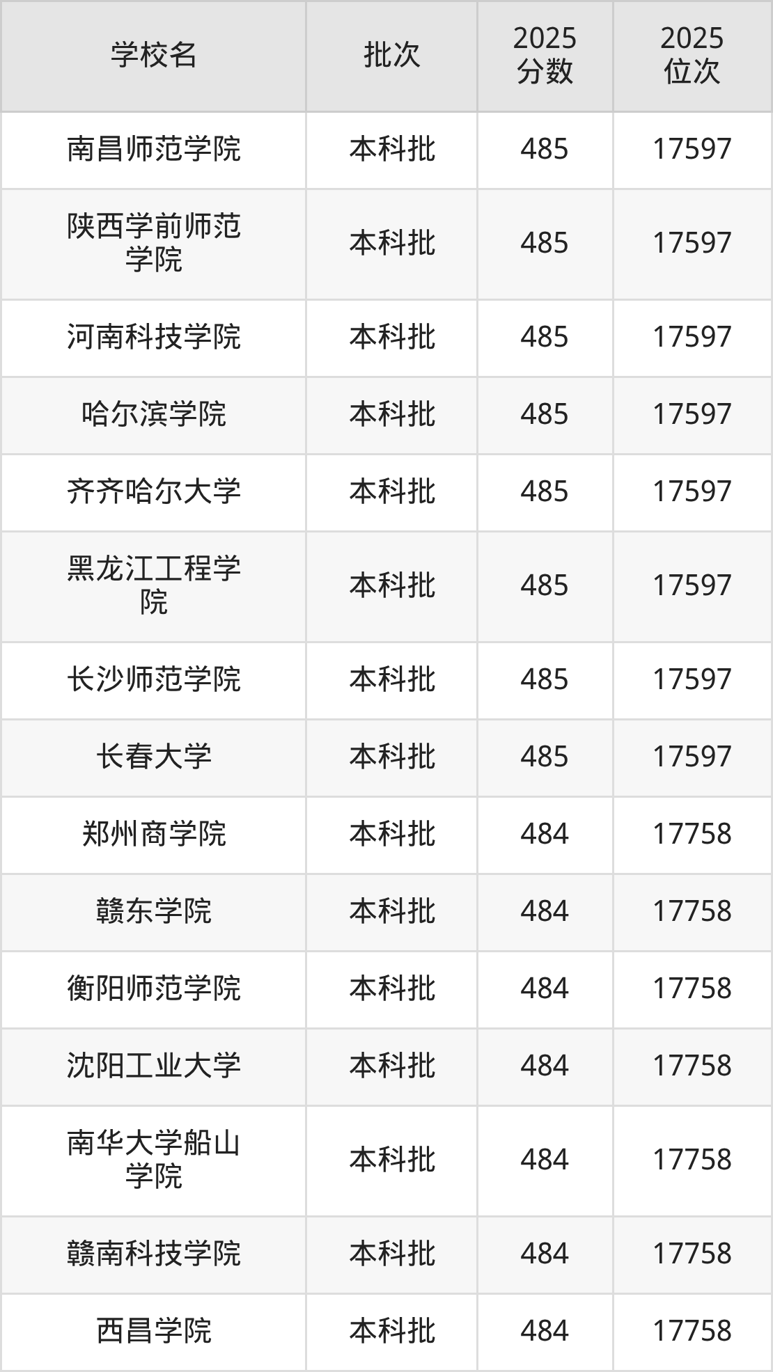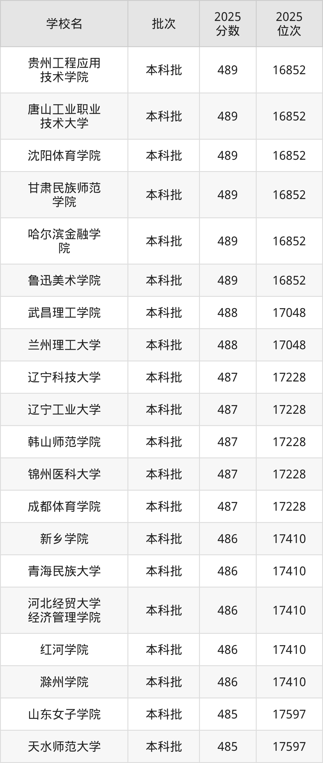 2025年辽宁高考历史类486分(17229名~17410名)能上的大学有新乡学院、青海民族大学、滁州学院、红河学院等。