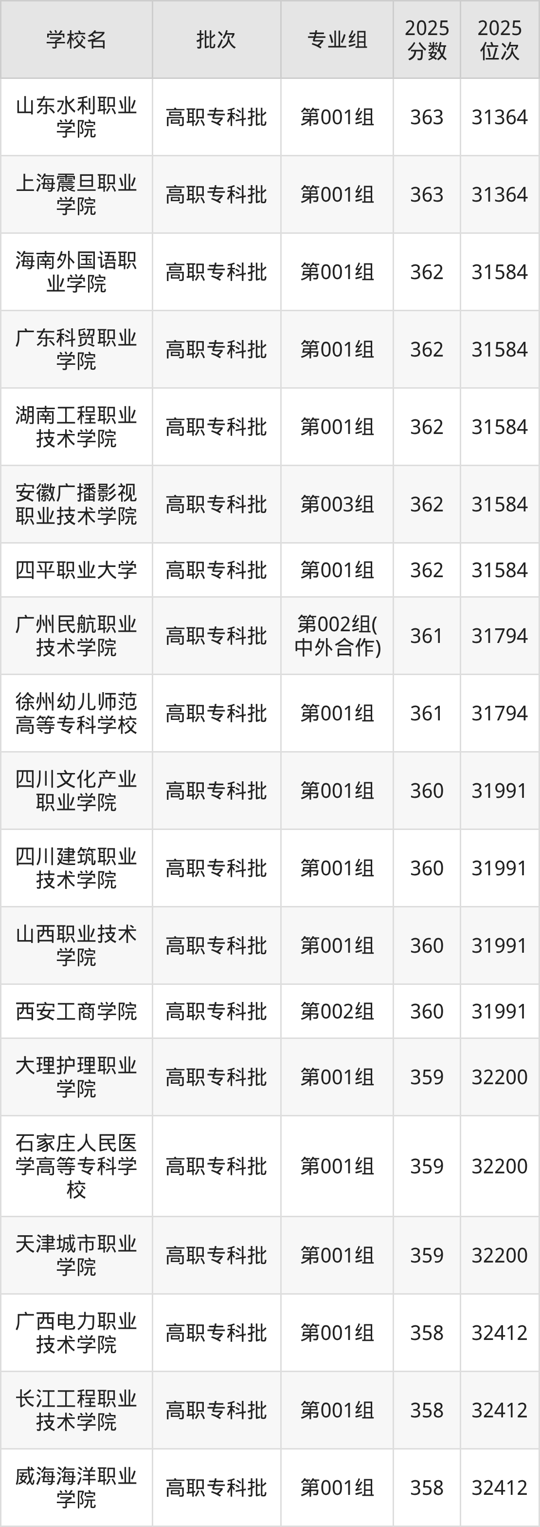 2025年黑龙江高考历史类360分(31795名~31991名)能上的大学有西安工商学院第002组、山西职业技术学院第001组、四川建筑职业技术学院第001组、四川文化产业职业学院第001组。