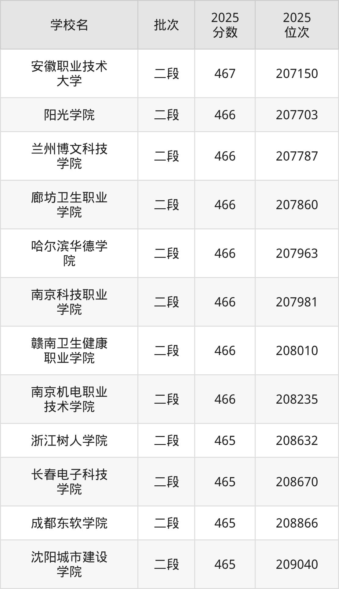 2025年浙江高考466分(207624名~208543名)能上的大学有廊坊卫生职业学院、哈尔滨华德学院、阳光学院、南京机电职业技术学院等。