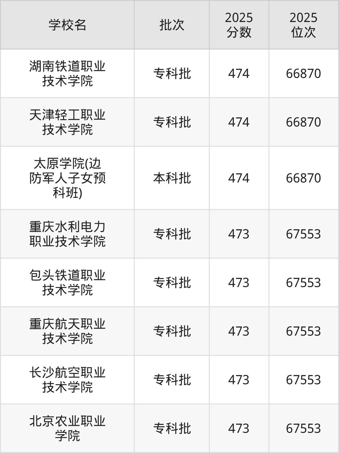 2025年河北高考历史类473分(66871名~67553名)能上的大学有北京农业职业学院、长沙航空职业技术学院、包头铁道职业技术学院、重庆航天职业技术学院等。
