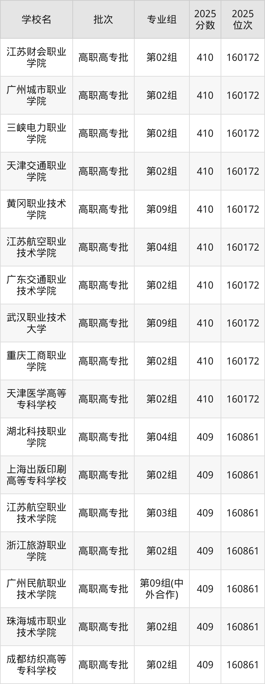 2025年湖北高考物理类409分(160173名~160861名)能上的大学有湖北科技职业学院第04组、上海出版印刷高等专科学校第02组、江苏航空职业技术学院第03组、浙江旅游职业学院第02组等。