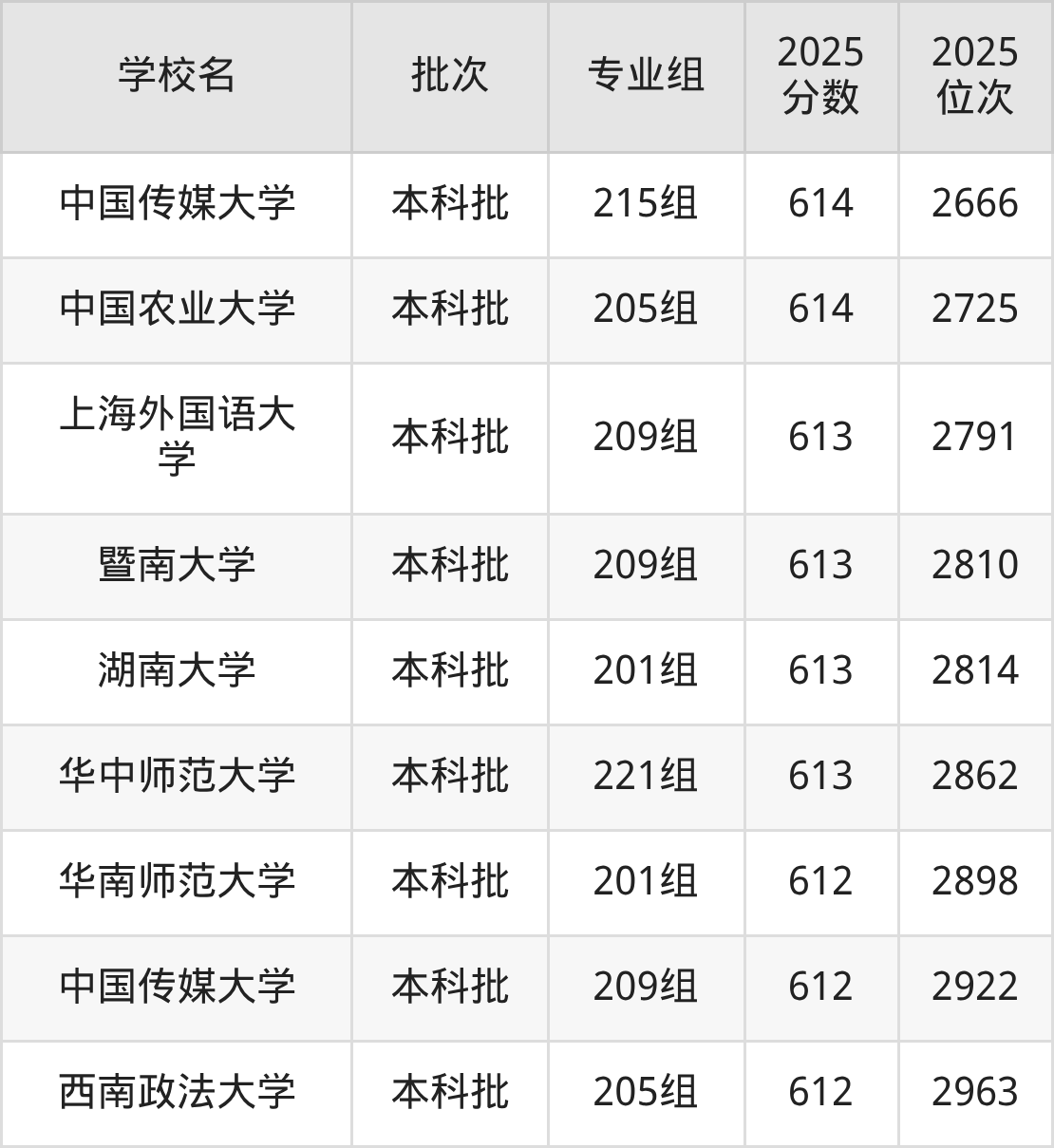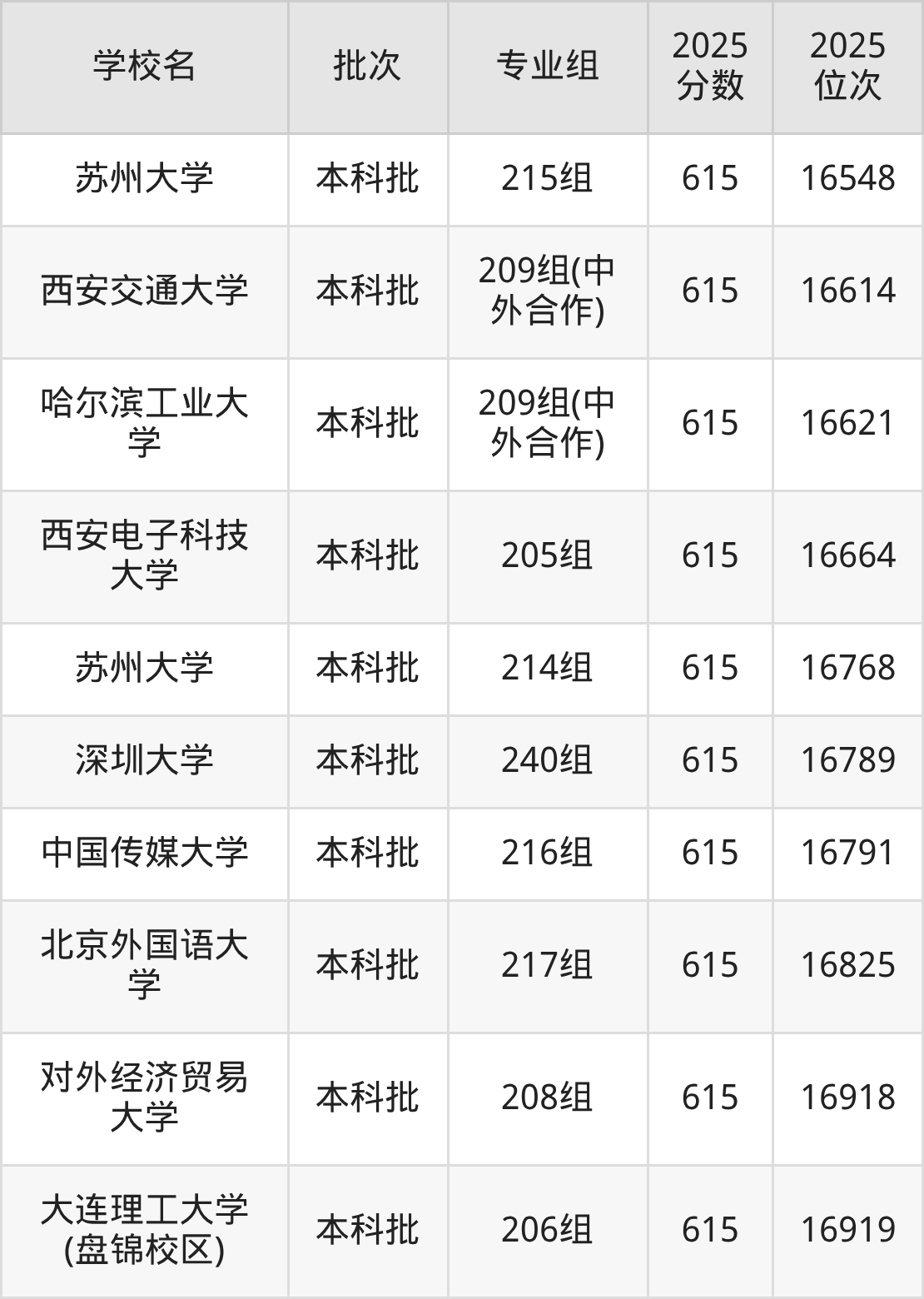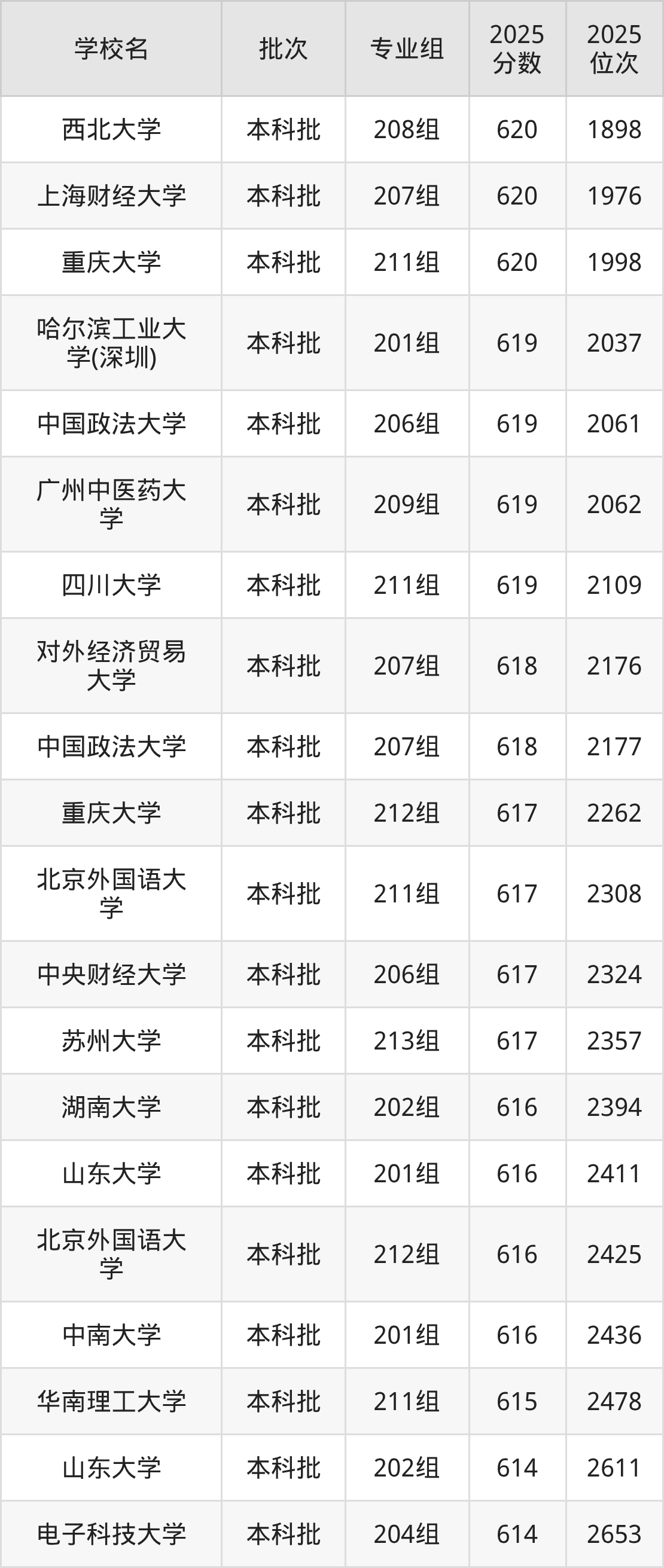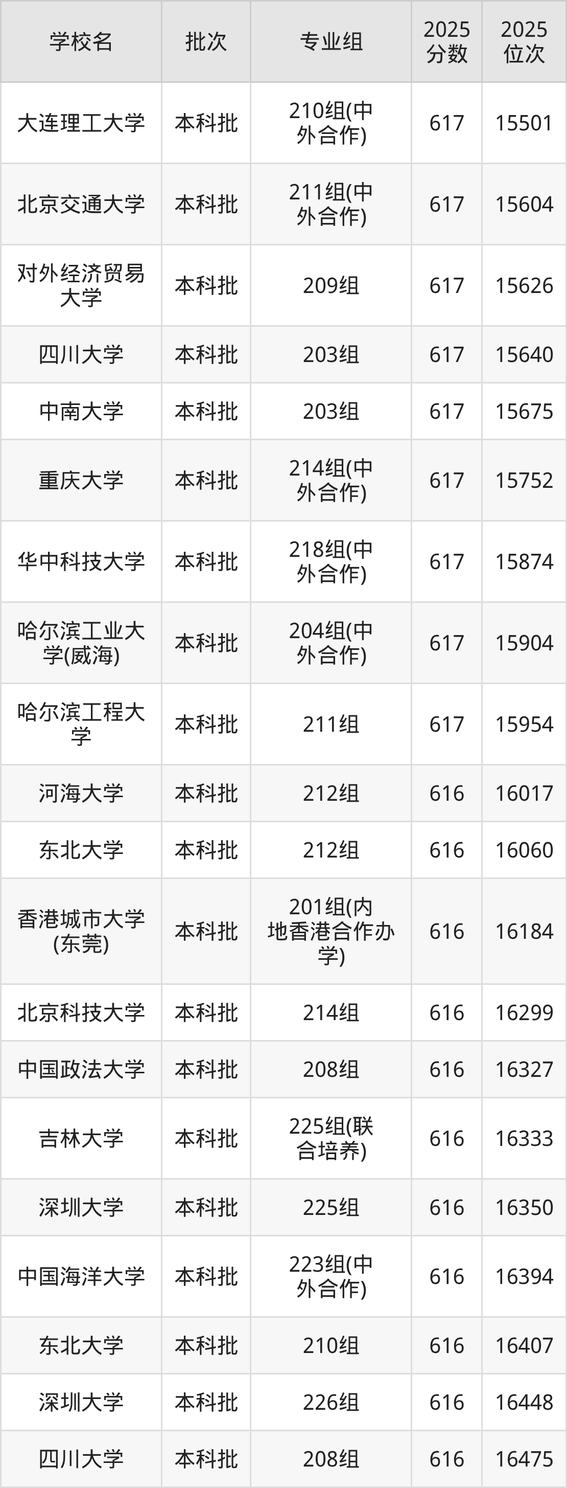 2025年广东高考历史类616分(2367名~2472名)能上的大学有北京外国语大学212组、山东大学201组、湖南大学202组、中南大学201组。