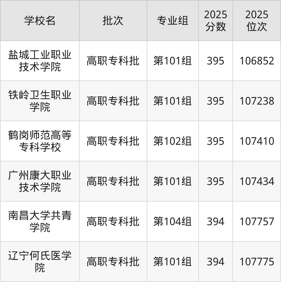 2025年江西高考历史类395分(106806名~107514名)能上的大学有鹤岗师范高等专科学校第102组、铁岭卫生职业学院第101组、广州康大职业技术学院第101组、盐城工业职业技术学院第101组。