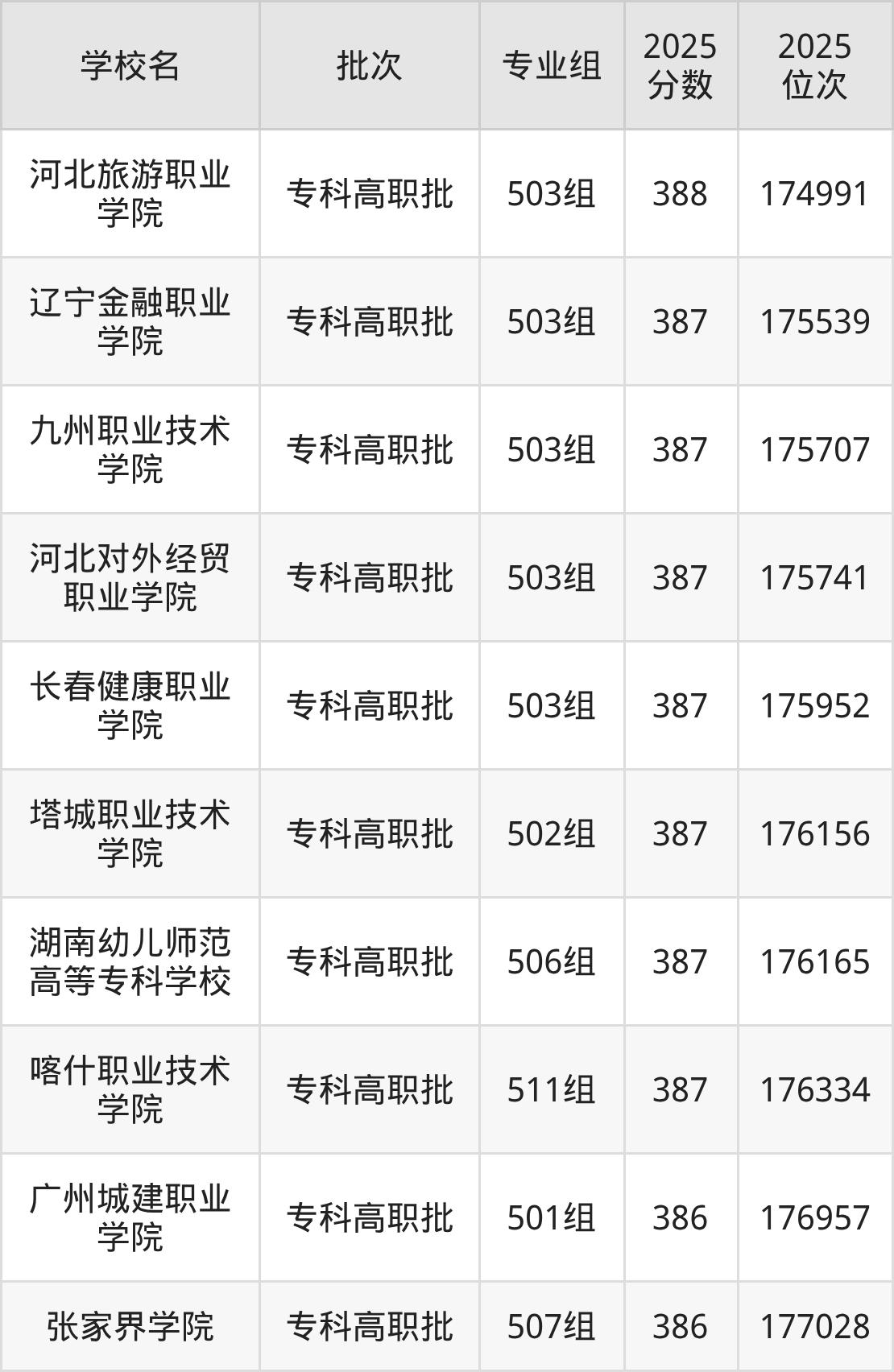2025年广东高考历史类387分(175414名~176555名)能上的大学有九州职业技术学院503组、辽宁金融职业学院503组、河北对外经贸职业学院503组、湖南幼儿师范高等专科学校506组等。