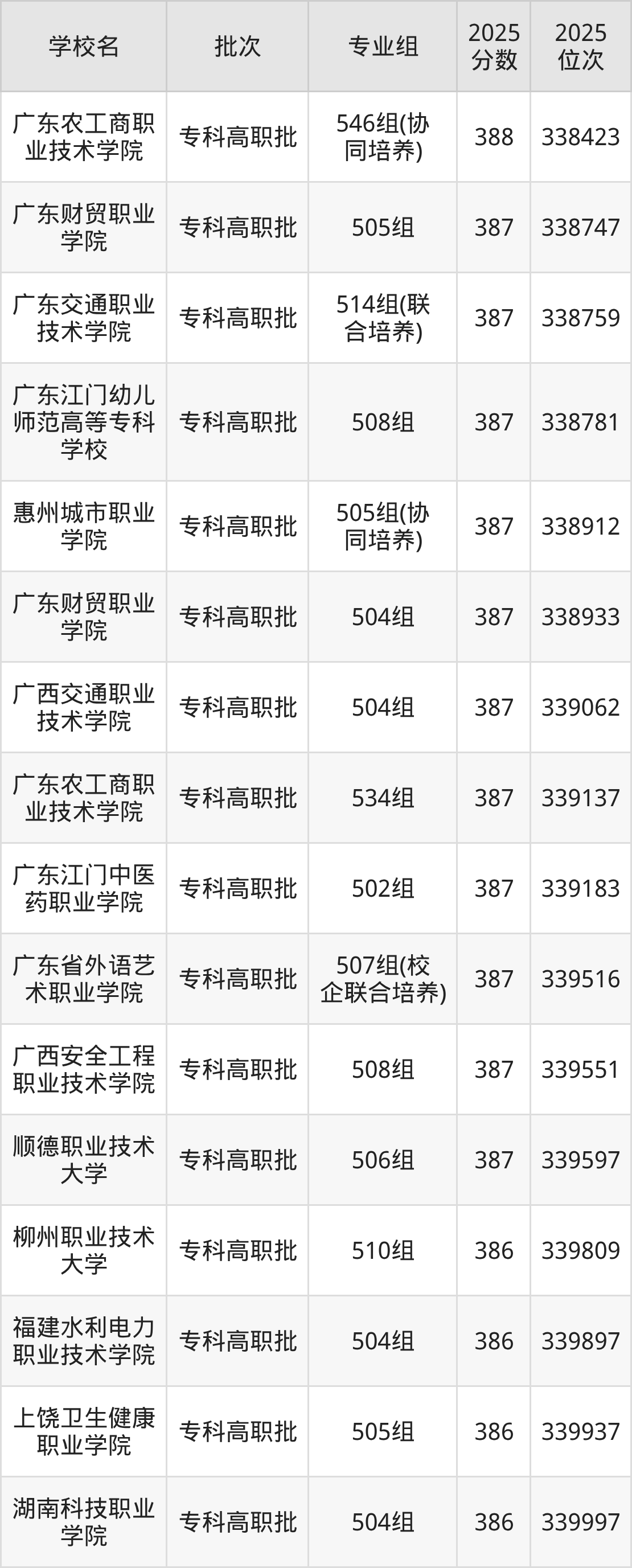 2025年广东高考物理类387分(338716名~339747名)能上的大学有顺德职业技术大学506组、广东交通职业技术学院514组(联合培养)、广东农工商职业技术学院534组、广西交通职业技术学院504组等。