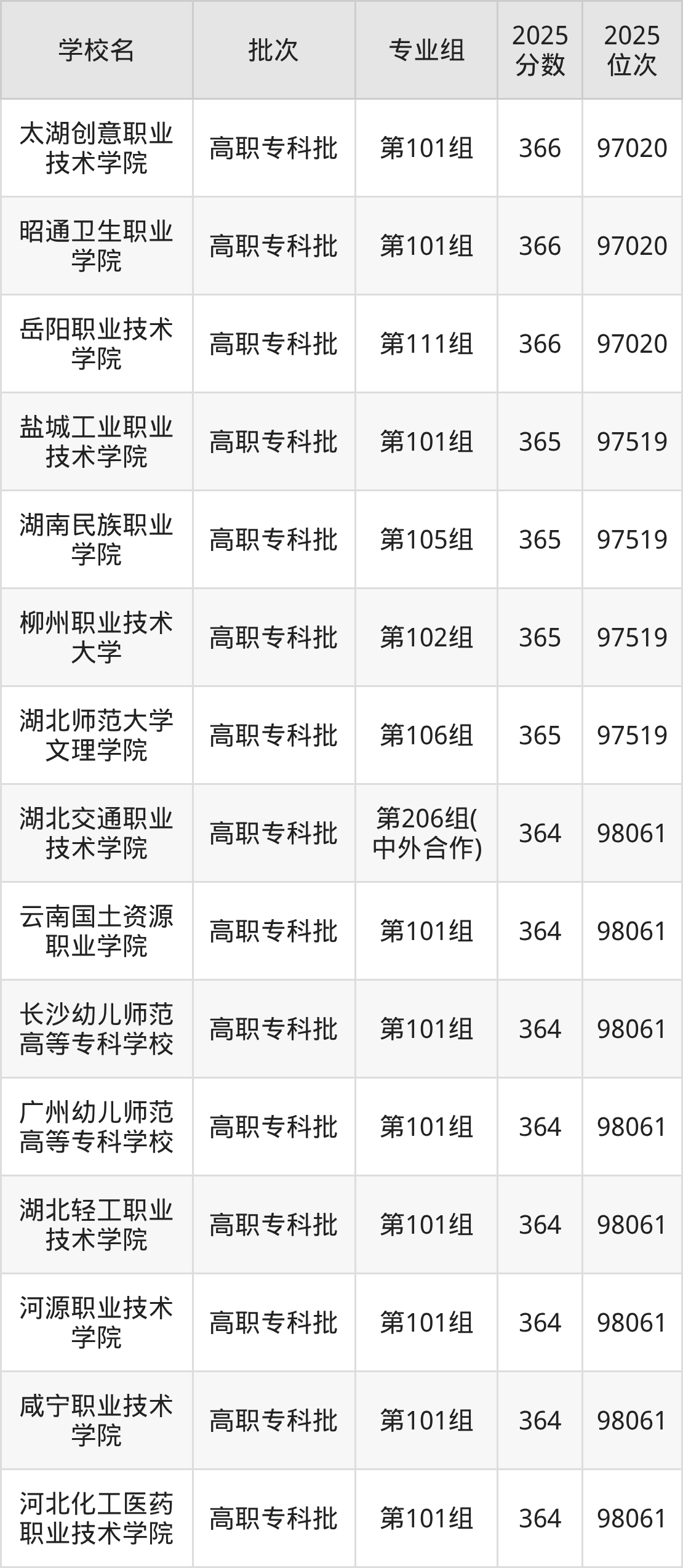 2025年湖南高考历史类364分(97520名~98061名)能上的大学有河北化工医药职业技术学院第101组、咸宁职业技术学院第101组、湖北交通职业技术学院第206组(中外合作)、湖北轻工职业技术学院第101组等。
