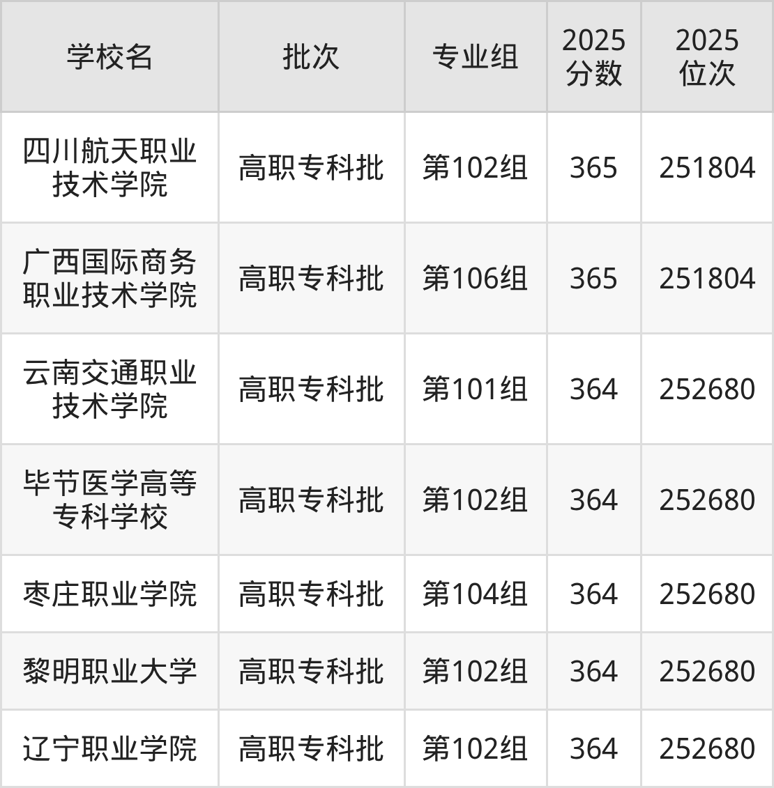2025年湖南高考物理类364分(251805名~252680名)能上的大学有辽宁职业学院第102组、黎明职业大学第102组、枣庄职业学院第104组、毕节医学高等专科学校第102组等。