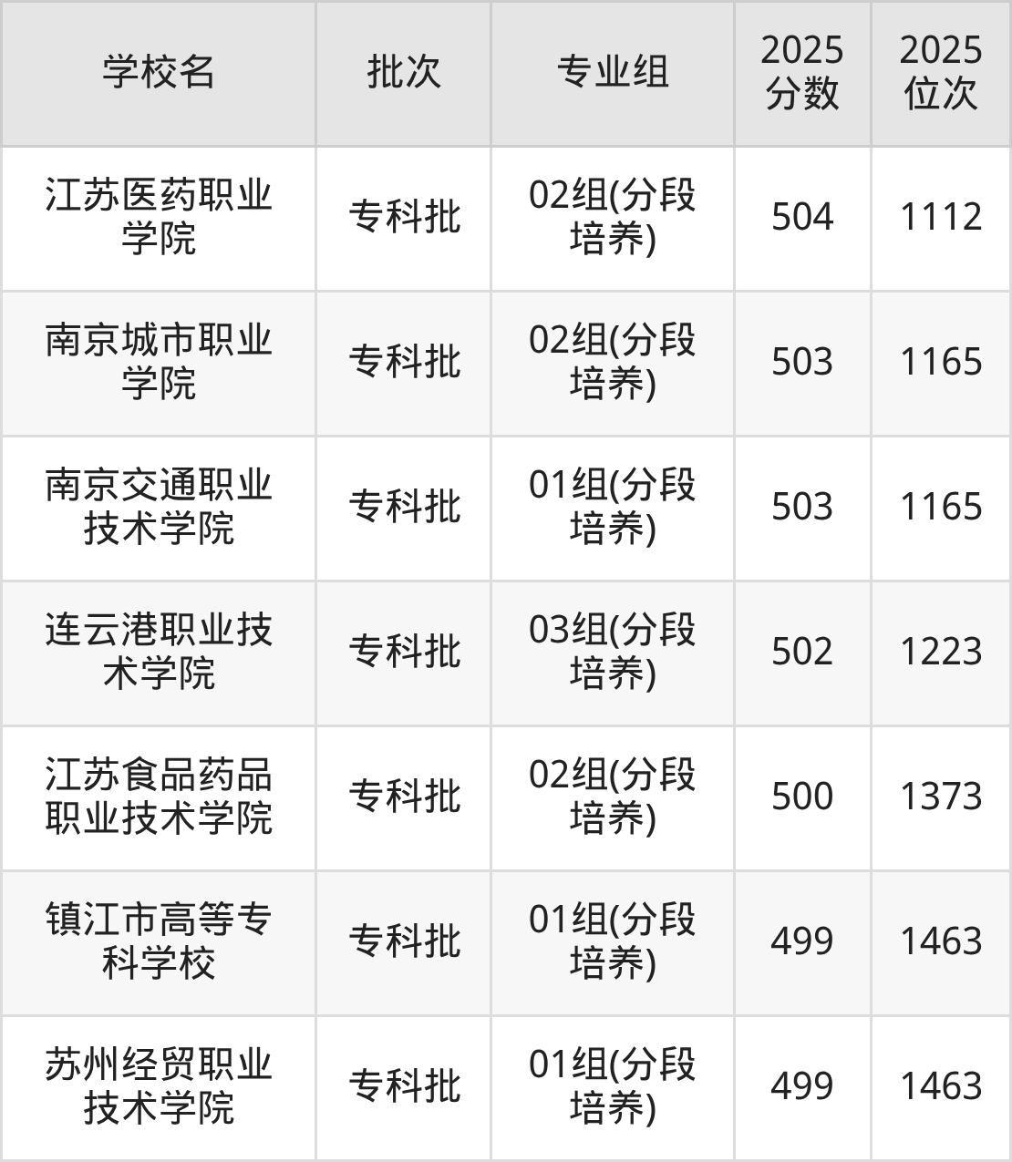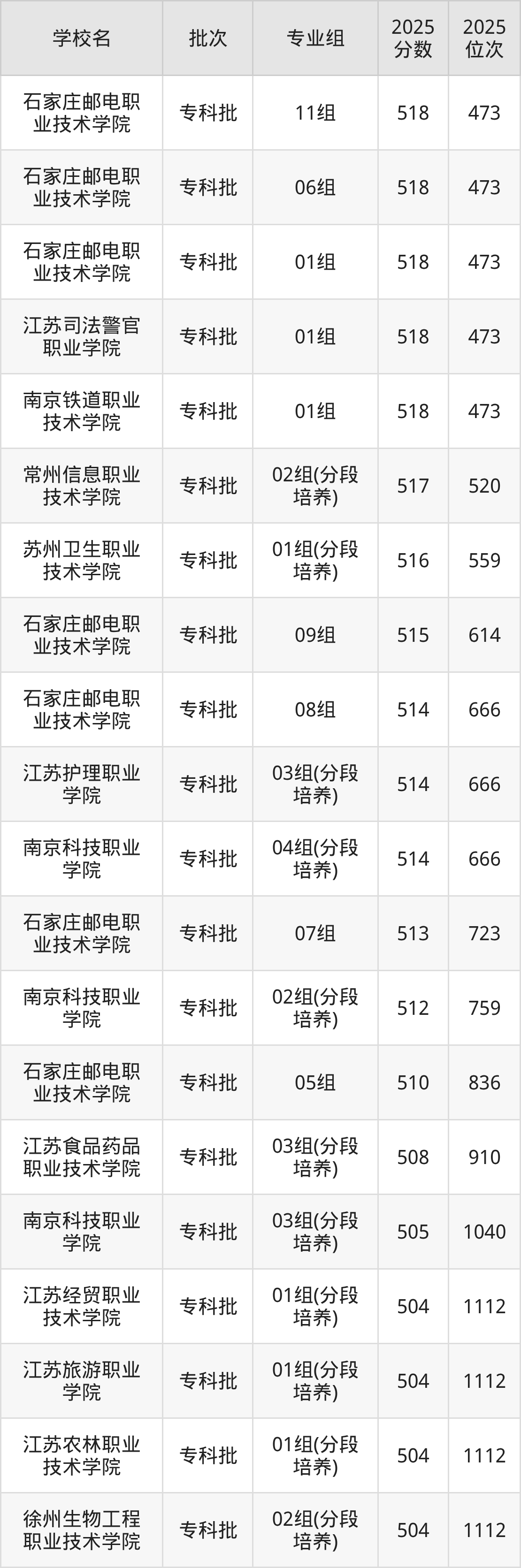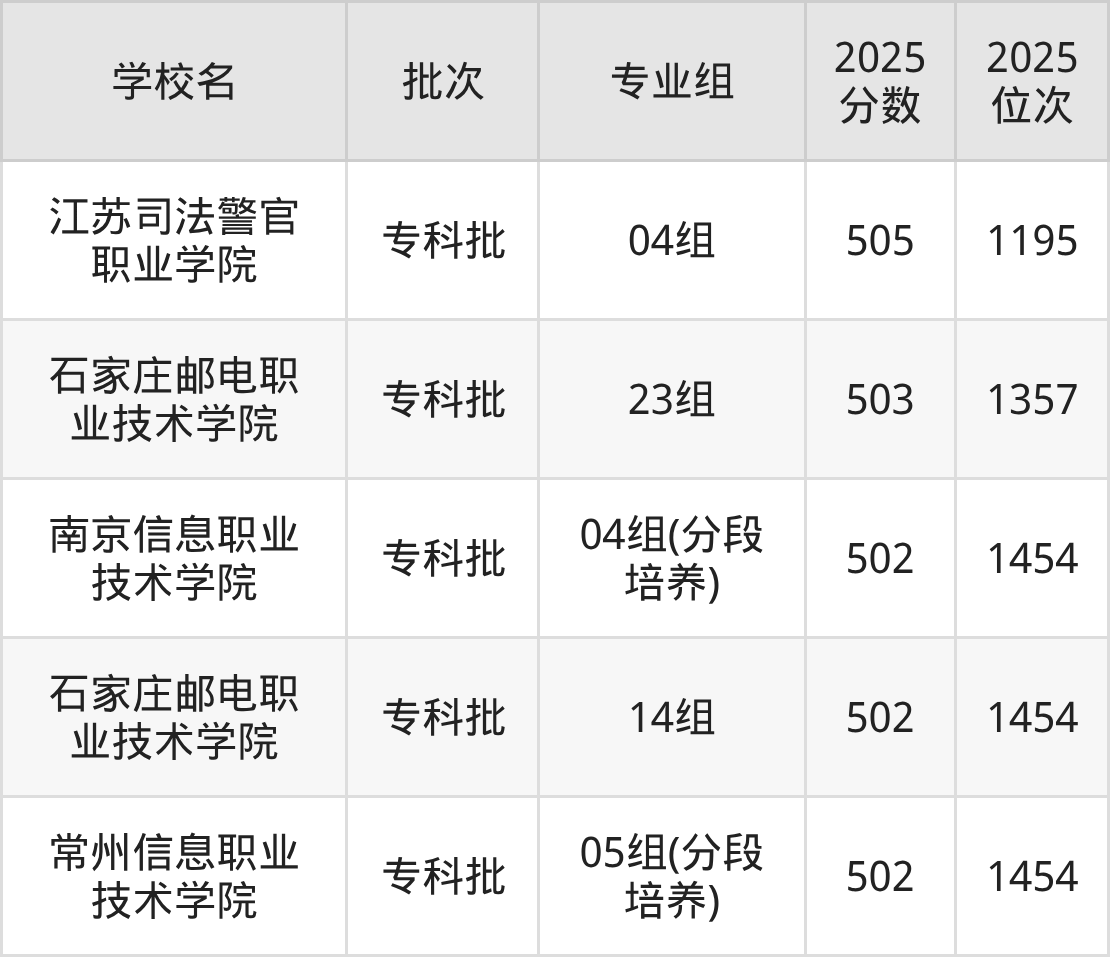 另外录取位次低于该区间(较稳妥)的有江苏司法警官职业学院04组(1195名)、石家庄邮电职业技术学院23组(1357名)等;录取位次高于该区间(可冲)的有常州工学院12组(中外合作)(153112名)、扬州职业技术大学05组(153112名)等。