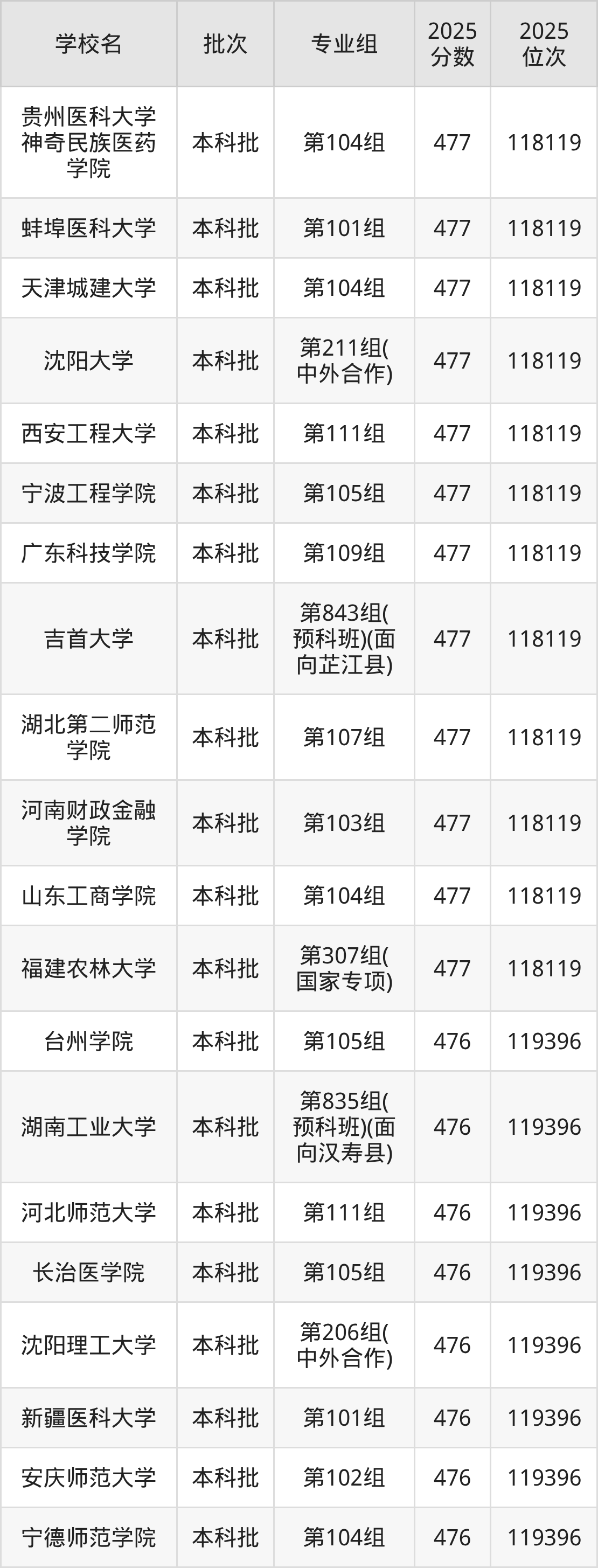 2025年湖南高考物理类476分(118120名~119396名)能上的大学有河北师范大学第111组、长治医学院第105组、辽宁工程技术大学第101组、沈阳理工大学第206组(中外合作)等。