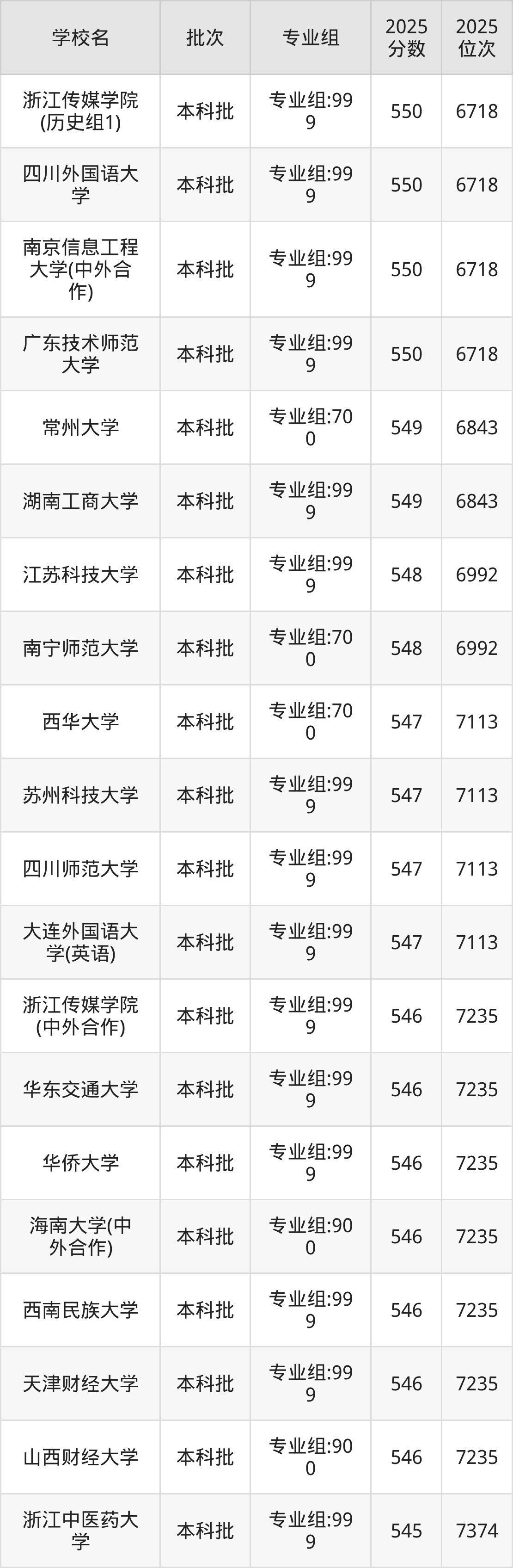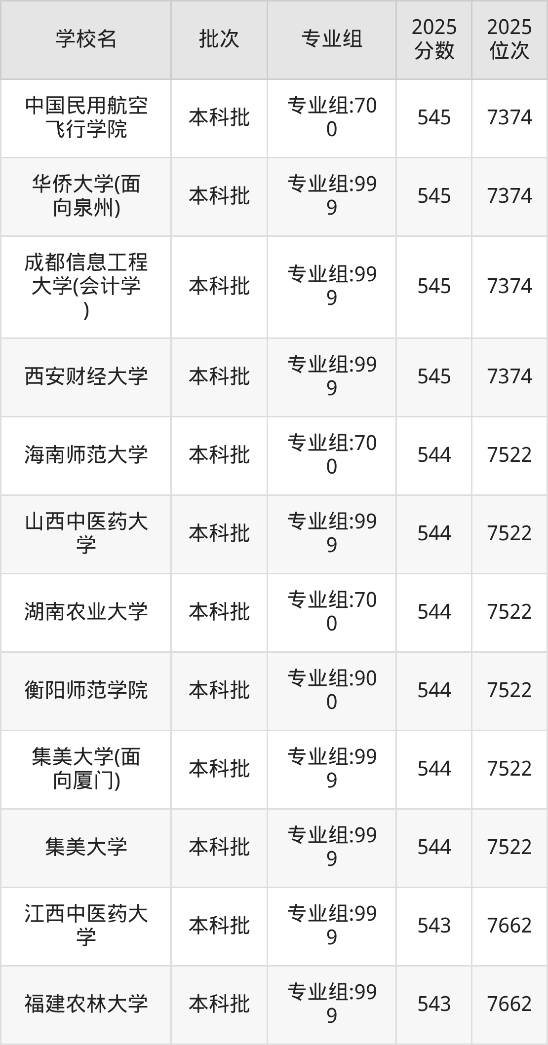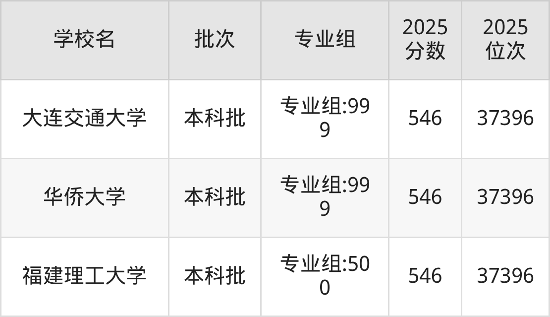 2025年福建高考历史类546分(7114名~7235名)能上的大学有华侨大学专业组:999、海南大学(中外合作)专业组:900、华东交通大学专业组:999、山西财经大学专业组:900等。