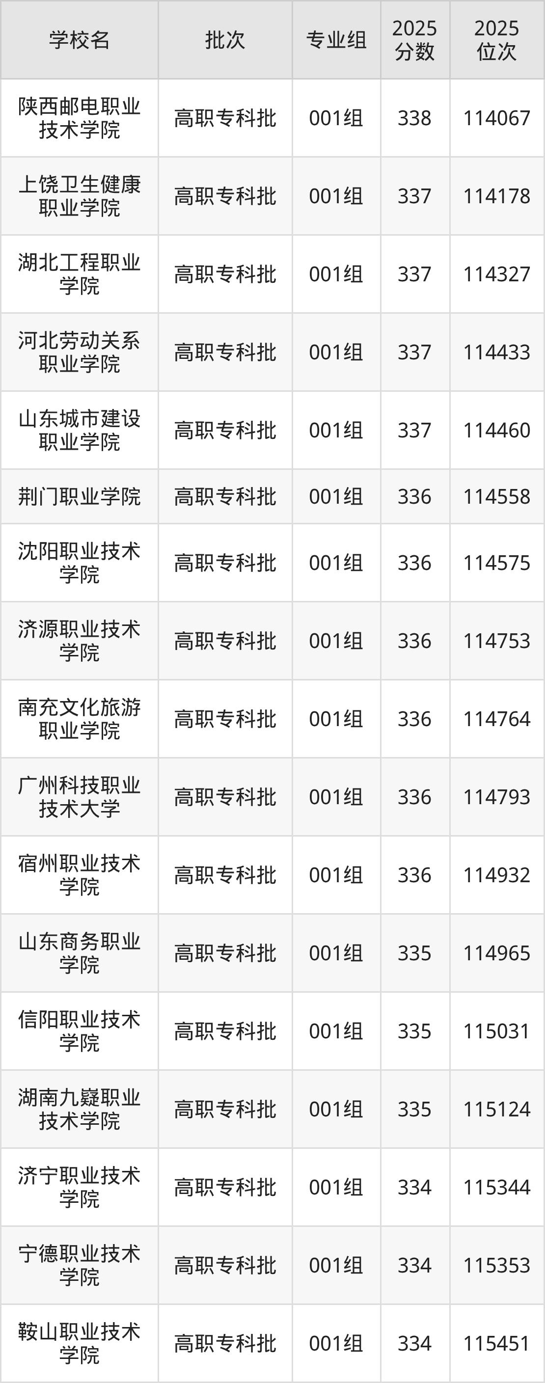 2025年安徽高考历史类336分(114555名~114951名)能上的大学有广州科技职业技术大学001组、济源职业技术学院001组、荆门职业学院001组、南充文化旅游职业学院001组等。