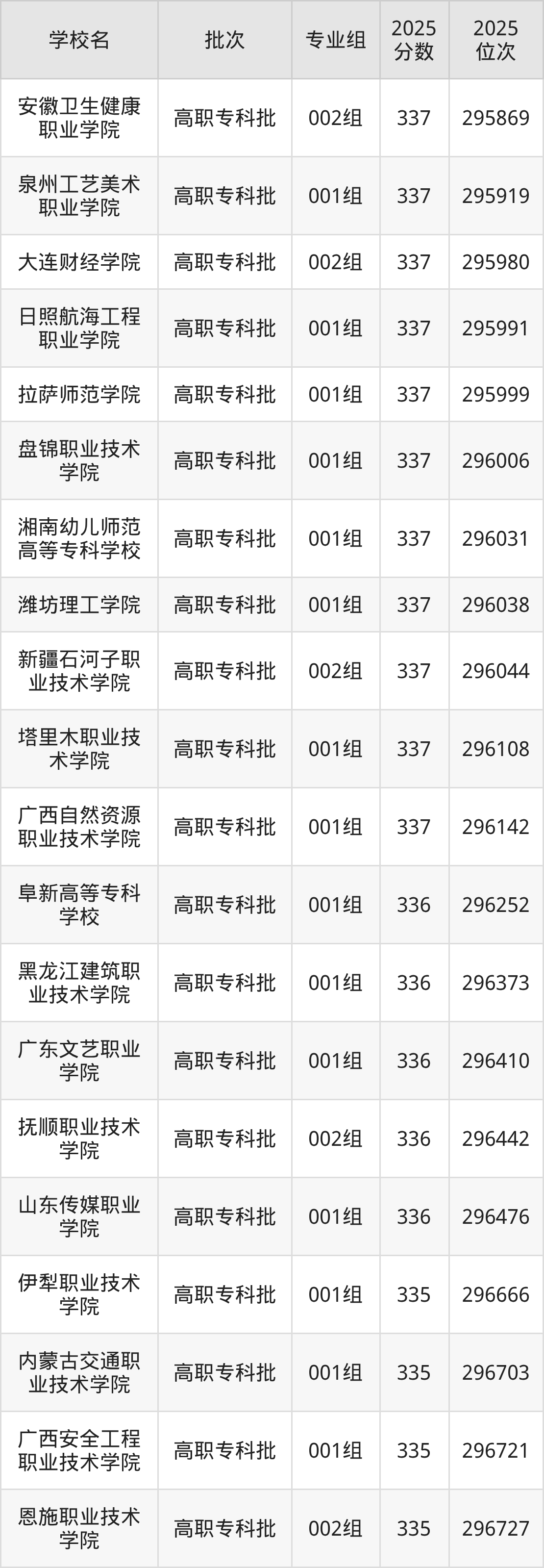 2025年安徽高考物理类336分(296173名~296556名)能上的大学有抚顺职业技术学院002组、阜新高等专科学校001组、广东文艺职业学院001组、黑龙江建筑职业技术学院001组等。