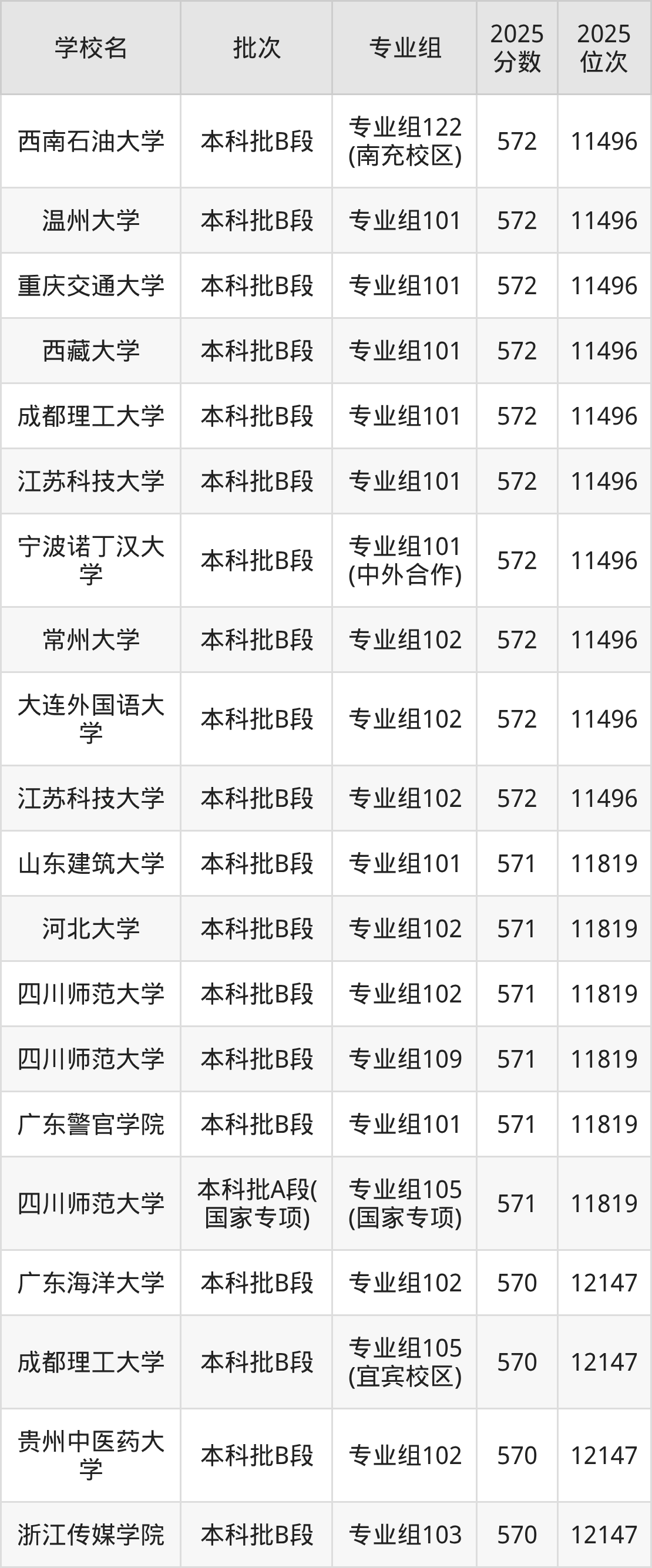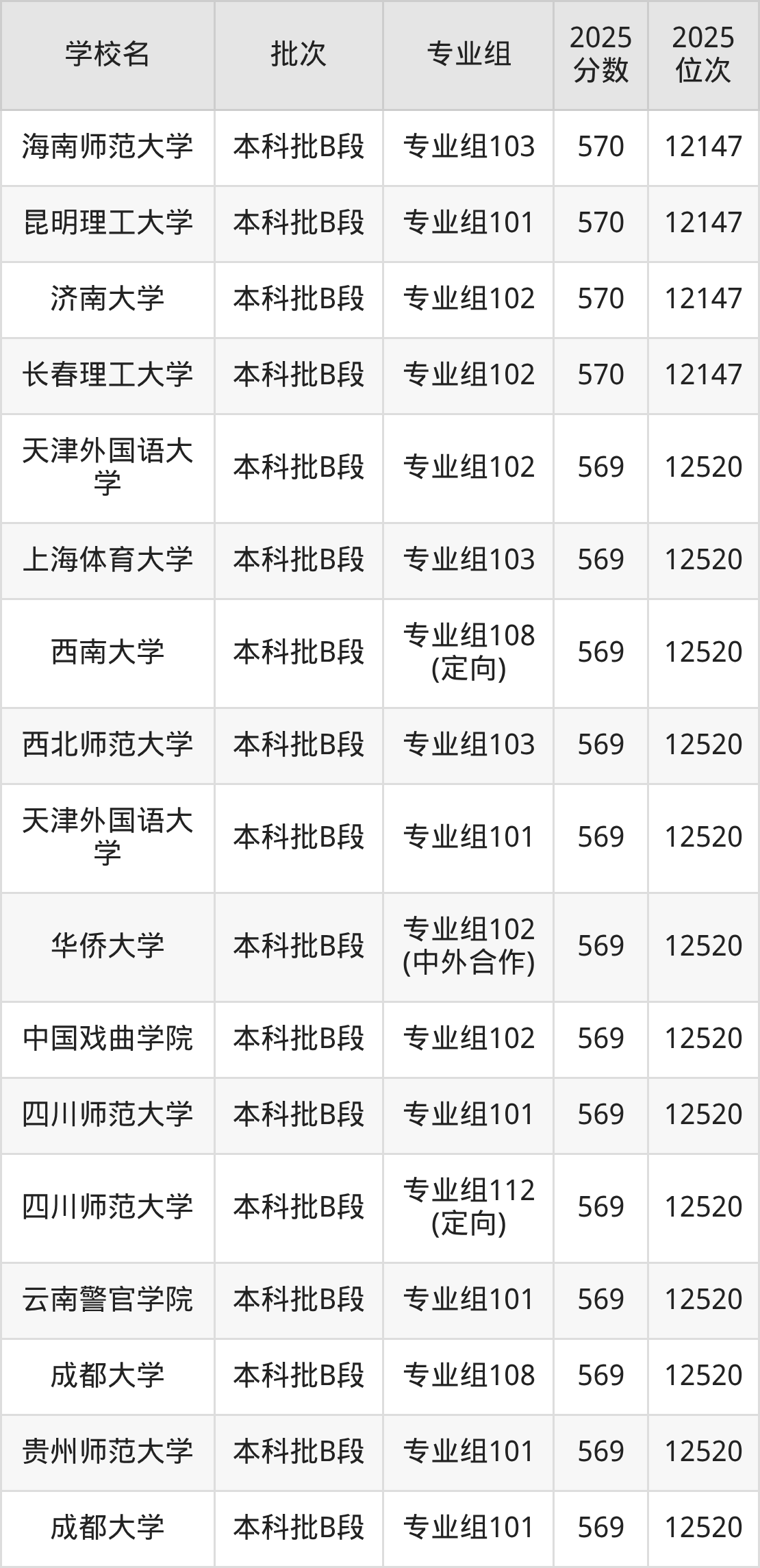 2025年四川高考历史类570分(11820名~12147名)能上的大学有昆明理工大学专业组101、济南大学专业组102、长春理工大学专业组102、成都理工大学专业组105(宜宾校区)等。