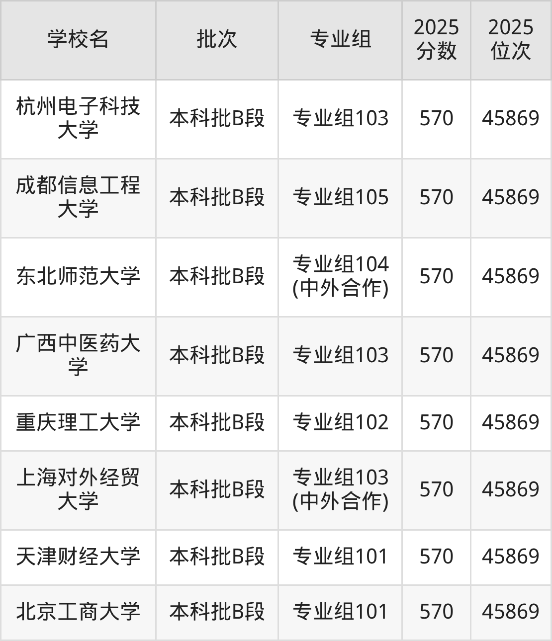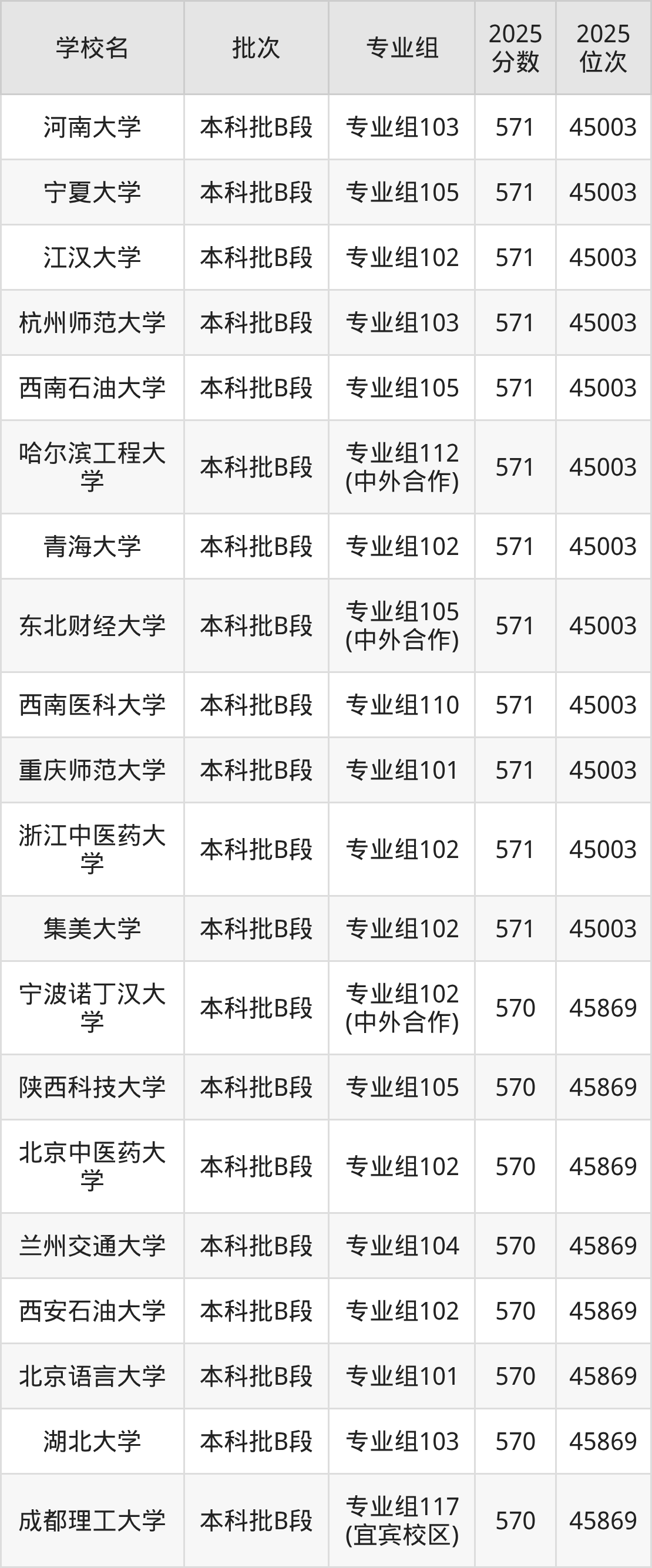2025年四川高考物理类570分(45004名~45869名)能上的大学有湖北大学专业组103、北京语言大学专业组101、西安石油大学专业组102、兰州交通大学专业组104等。