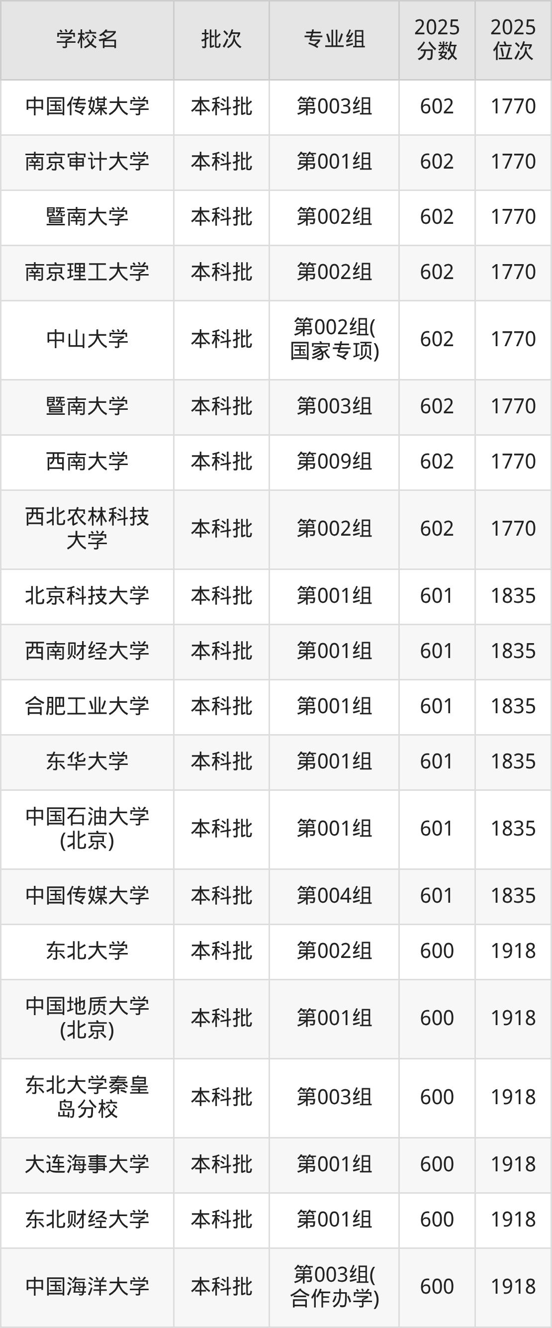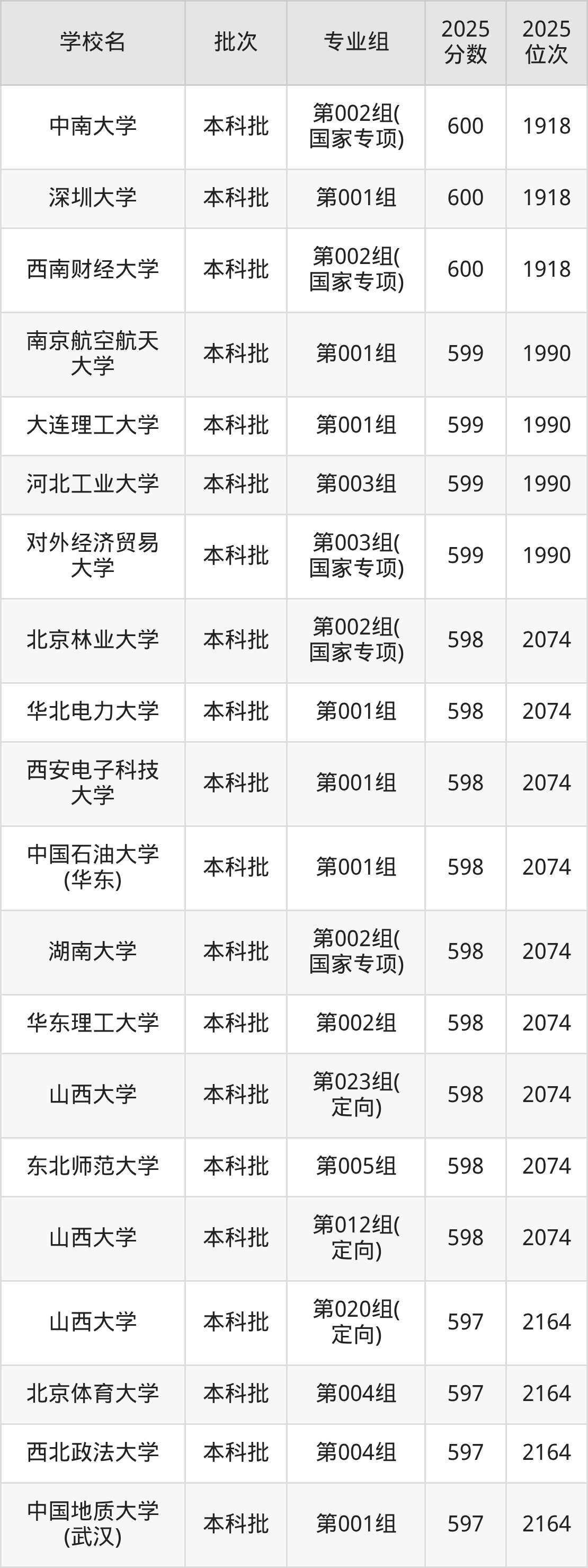 2025年山西高考历史类599分(1919名~1990名)能上的大学有对外经济贸易大学第003组(国家专项)、河北工业大学第003组、大连理工大学第001组、南京航空航天大学第001组。