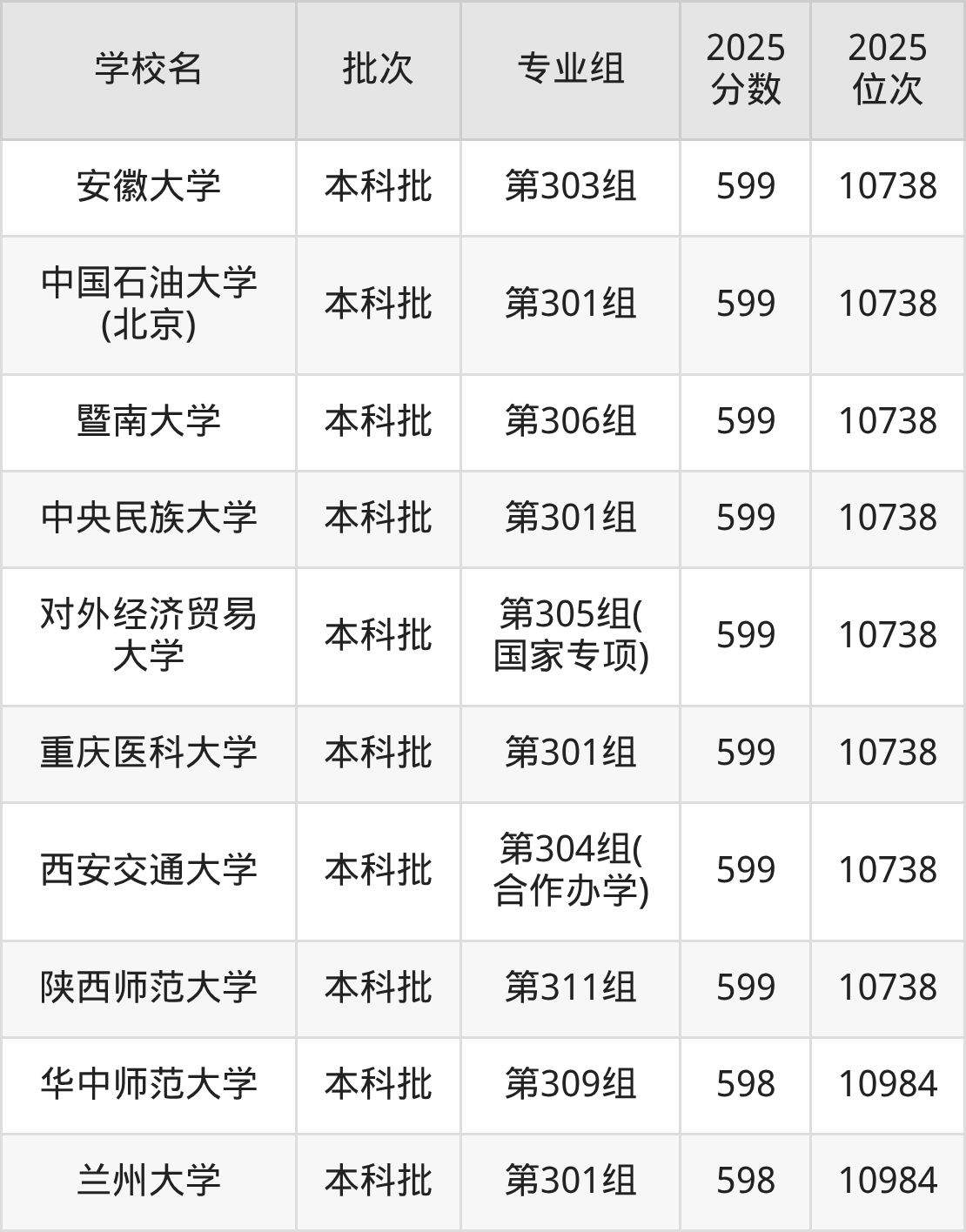 2025年山西高考物理类599分(10453名~10738名)能上的大学有对外经济贸易大学第305组(国家专项)、中央民族大学第301组、中国石油大学(北京)第301组、中国石油大学(北京)第302组等。