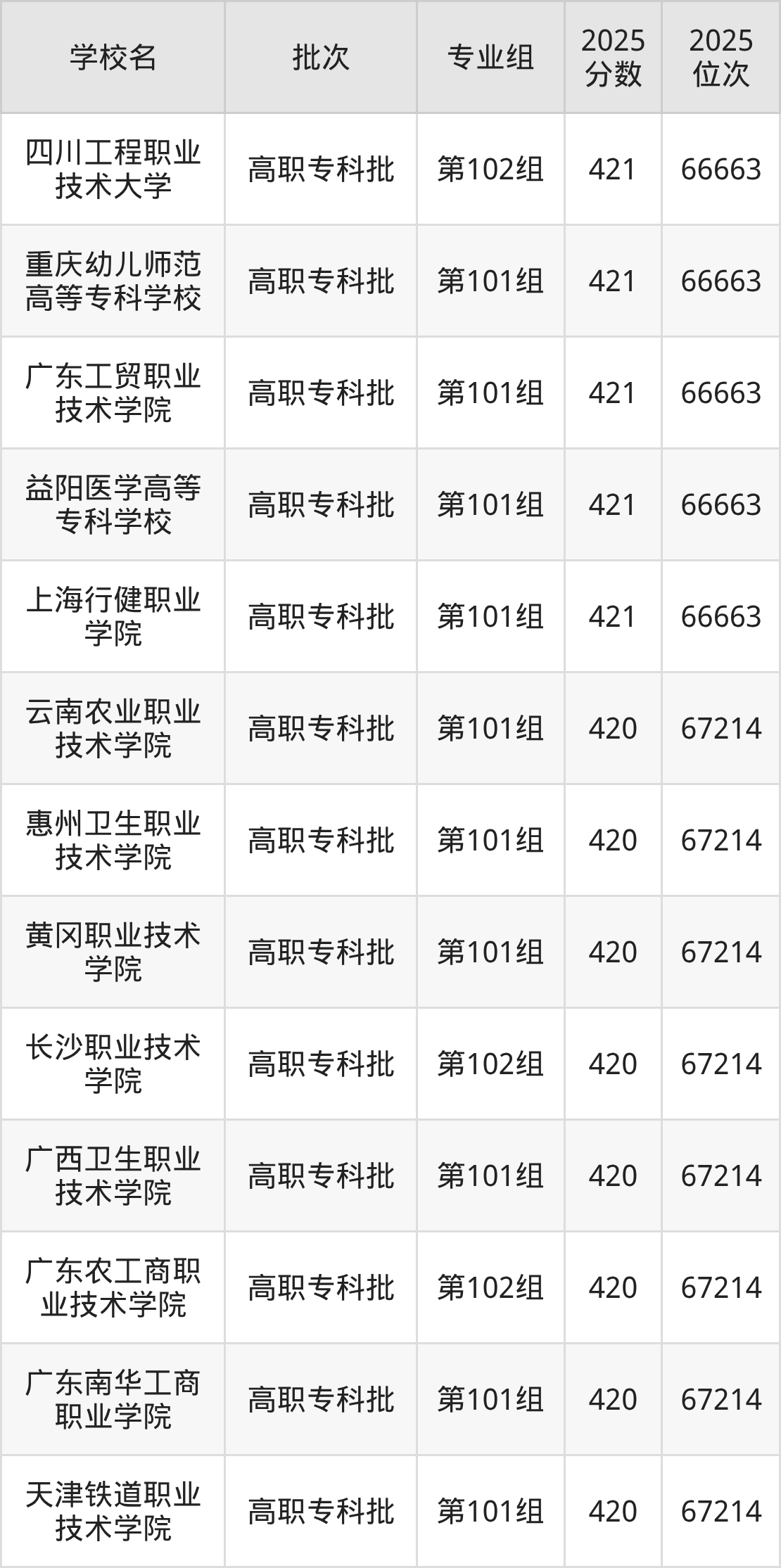 2025年湖南高考历史类420分(66664名~67214名)能上的大学有天津铁道职业技术学院第101组、广东南华工商职业学院第101组、广东农工商职业技术学院第102组、广西卫生职业技术学院第101组等。