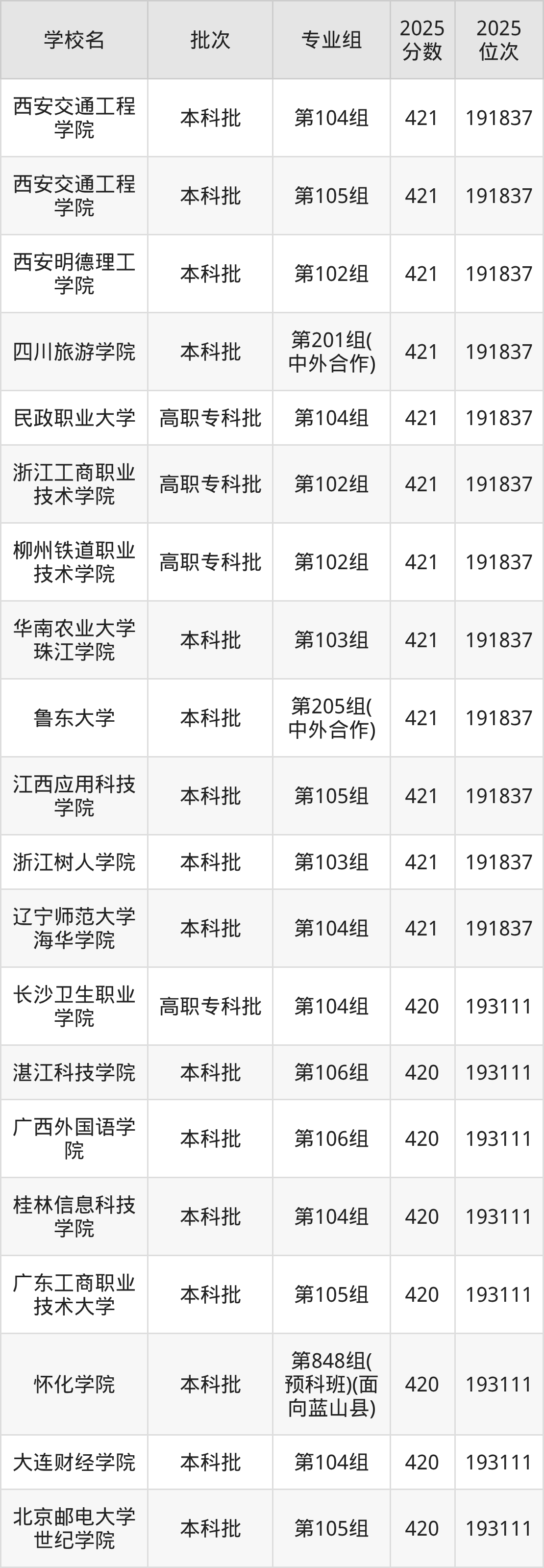 2025年湖南高考物理类420分(191838名~193111名)能上的大学有北京邮电大学世纪学院第105组、大连财经学院第104组、怀化学院第848组(预科班)(面向蓝山县)、广东工商职业技术大学第105组等。