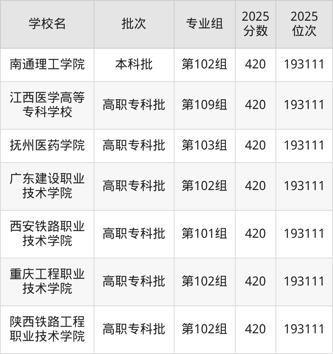 湖南高考420分:历史类排名67214位、物理类排名193111位。该分数位次对应能上的大学历史类有天津铁道职业技术学院第101组、广东南华工商职业学院第101组;物理类有北京邮电大学世纪学院第105组、大连财经学院第104组,更多名单如下文所示,2026届考生可参考。
