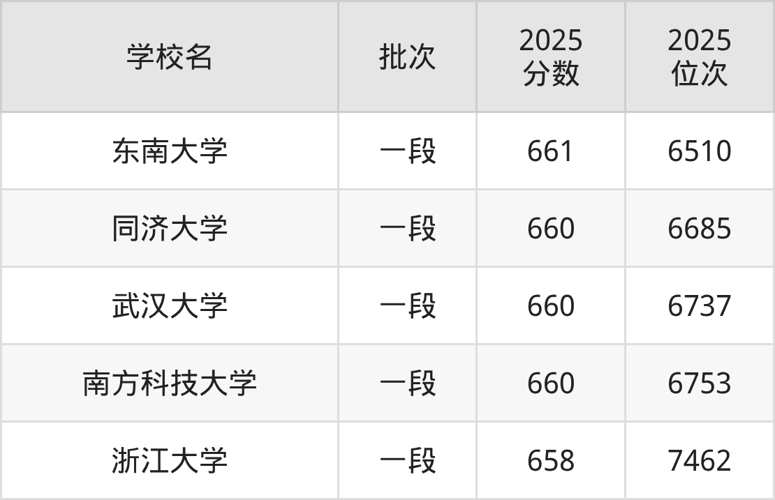 2025年浙江高考660分(6613名~6995名)能上的大学有南方科技大学、武汉大学、同济大学。