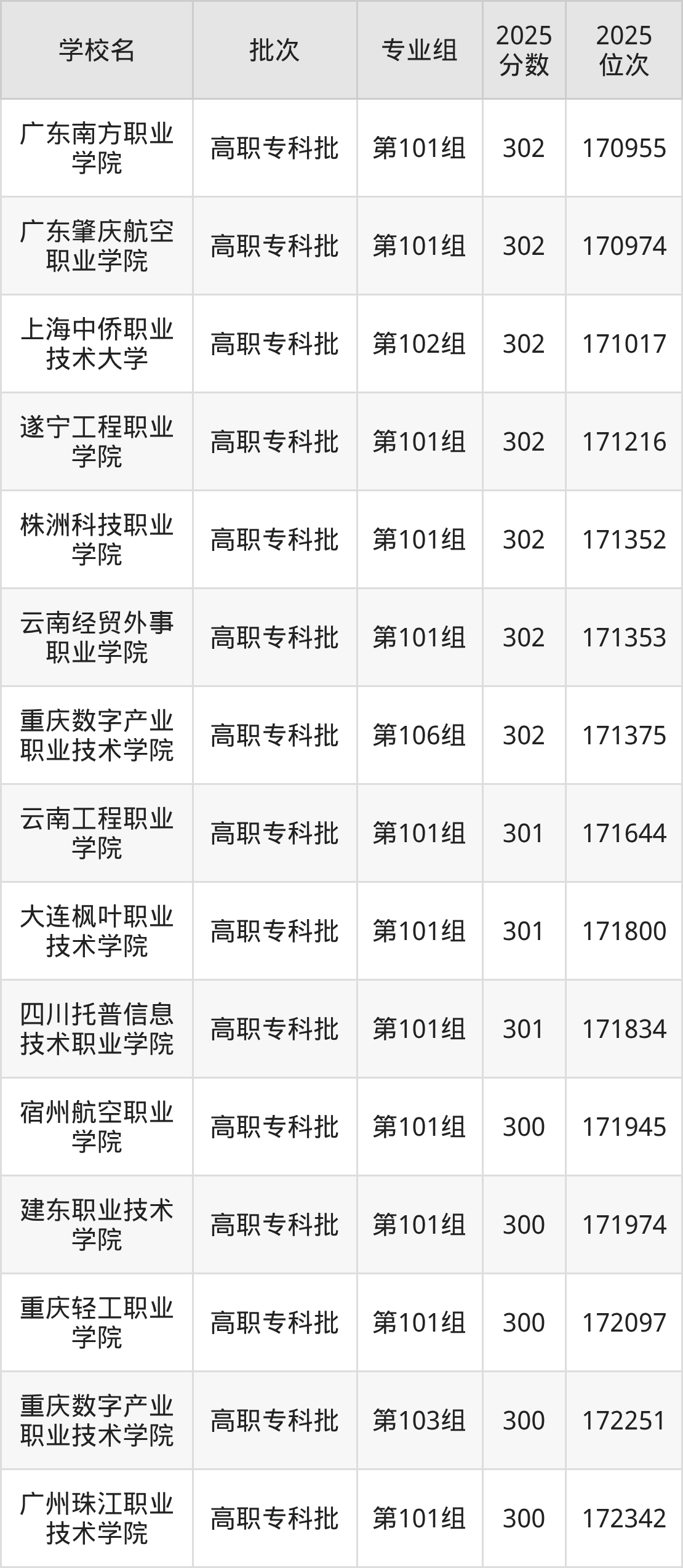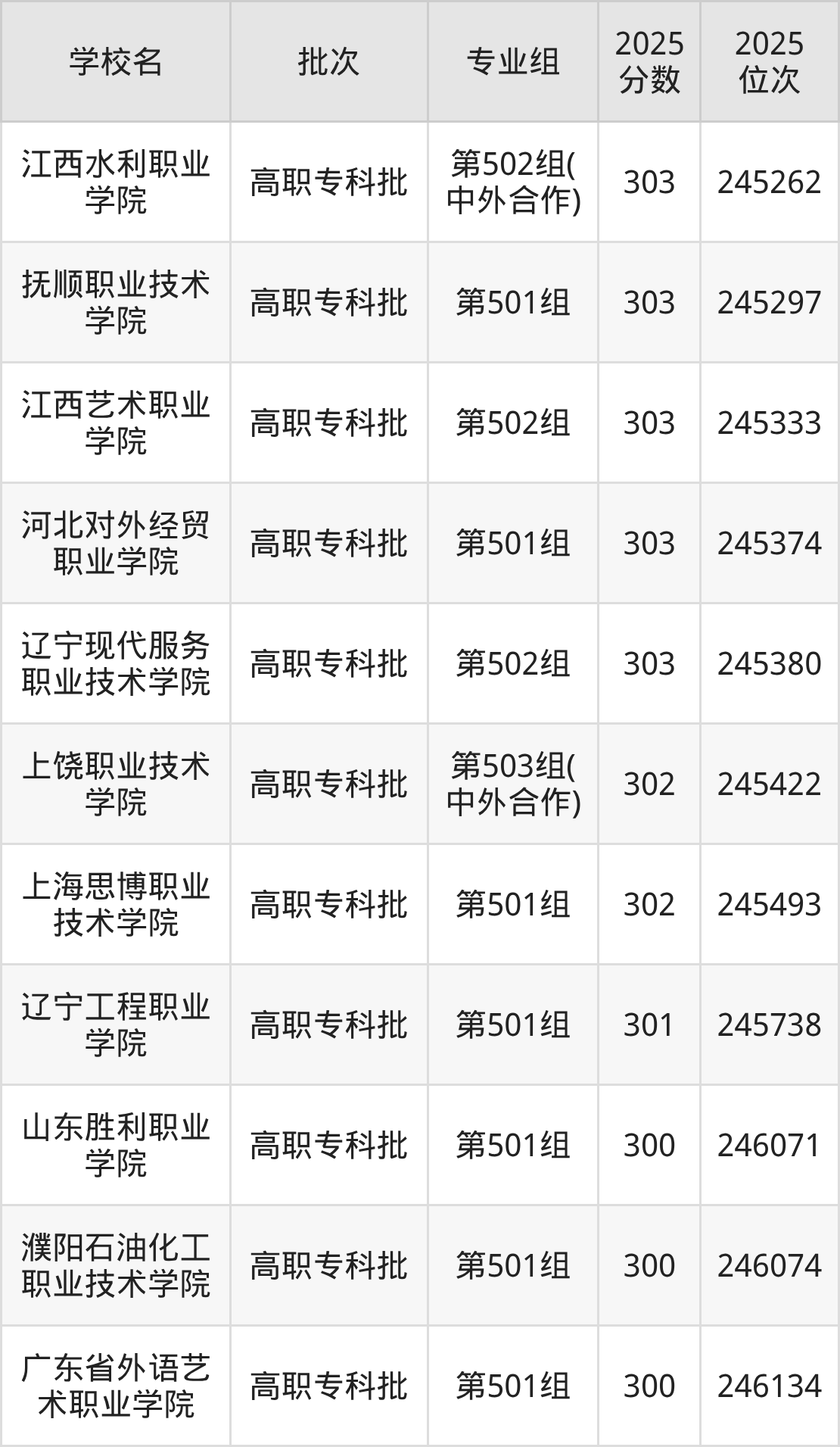 2025年江西高考历史类301分(171397名~171907名)能上的大学有云南工程职业学院第101组、大连枫叶职业技术学院第101组、四川托普信息技术职业学院第101组。